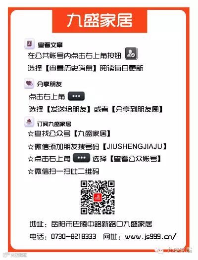 如果您还没有关注我,请点击图片上面日期右边【九盛家居】再点击“关注”,就可关注我!我们每天将会与您分享世界上最精华最精彩的资讯!