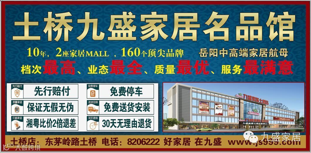九盛家居【土桥店】与【新路口店】两店强强联手共计160大家具品牌,6万平米高端卖场。共同打造岳阳中高端家具卖场航母!