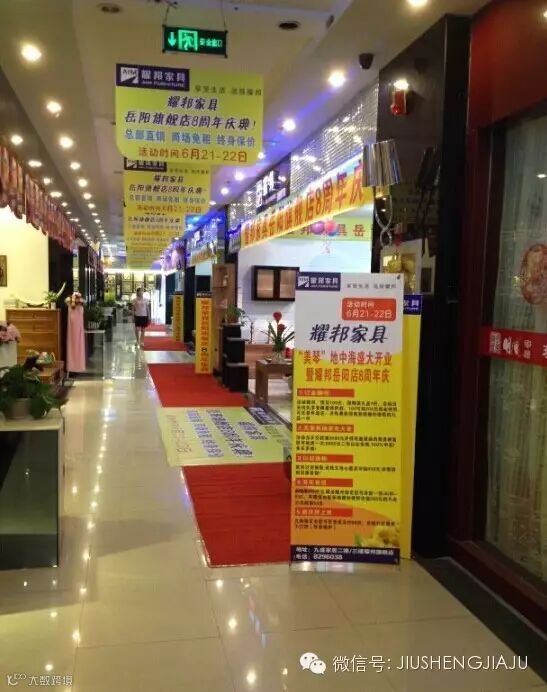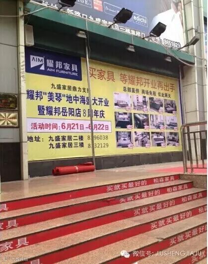 买家具,等耀邦开业再作出手!6月21-22日,九盛耀邦家具“美琴”地中海系列隆重开业暨耀邦家具岳阳旗舰店8周年庆典;多重好礼回馈岳阳市民:进店有礼,购物抽大奖;特价大床仅580元,家具旧换新最高补贴400元,省钱又省心,全场超低折扣,有买有送,终身保价!总部直供,商场免租,仅此两天!优惠力度前所未有!享受生活,选择耀邦!九盛耀邦家具全体员工期待您的光临!抢购热线:8296038 地址:岳阳九盛家居二楼/三楼耀邦旗舰店