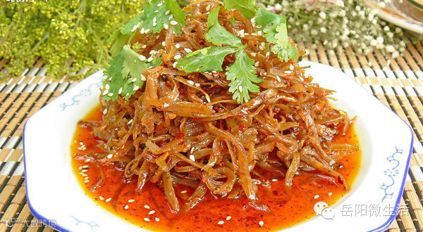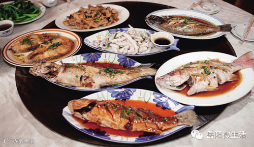 去岳阳就是要吃洞庭湖产的鲜鱼,岳阳的各酒家都很善于烹鱼,当地的“巴陵全鱼席”颇有特色,席上所有的菜肴都由鱼制成,但都各具风味,有松鼠桂鱼、藉丝银鱼、冰冻鱼胶、竹筒蒸鱼、清蒸全水鱼、蝴蝶过海(原料是黑鱼)、松籽鳝鱼等。