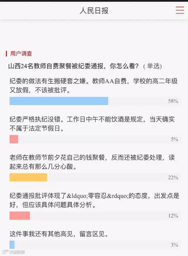 人民日报客户端给出的用户调查显示:58%的网友认为,纪委做法不妥。