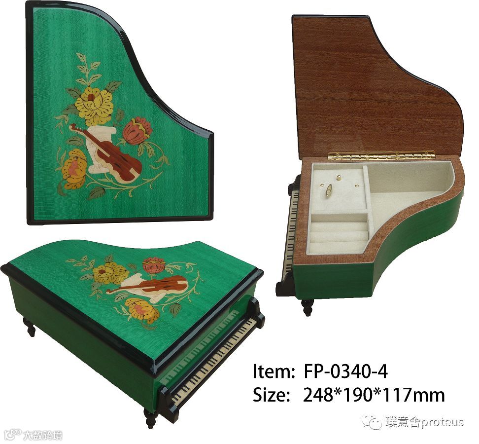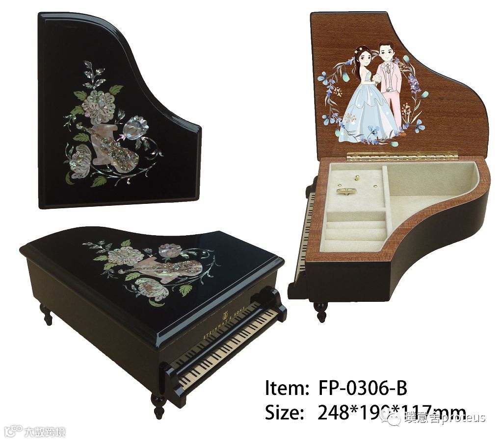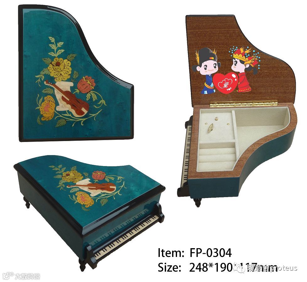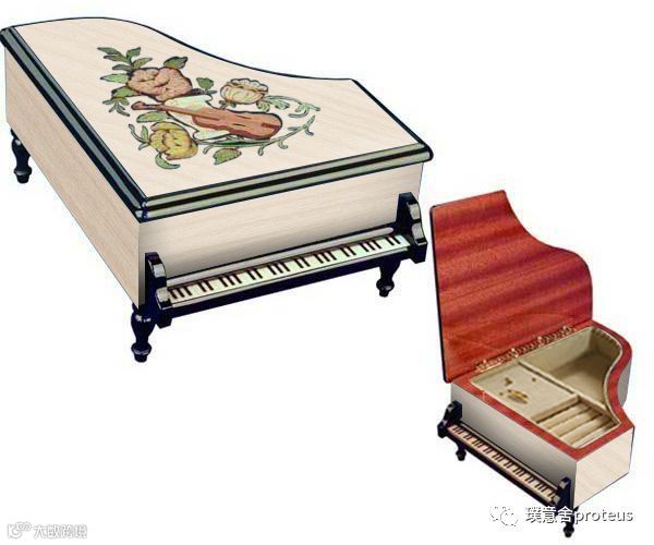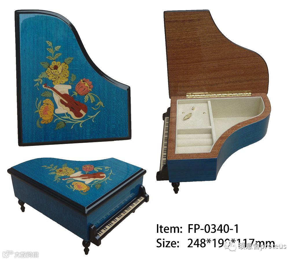 新款的音乐铃以三角钢琴形状为模板,表面以不同木皮颜色做底色,中间镶嵌拼花图案,外观美丽大方;内部以绒布隔板分开小隔间,加上音乐铃声芯片,合理利用空间存放不同的小饰品,使用时可以播放铃声,舒缓心情!