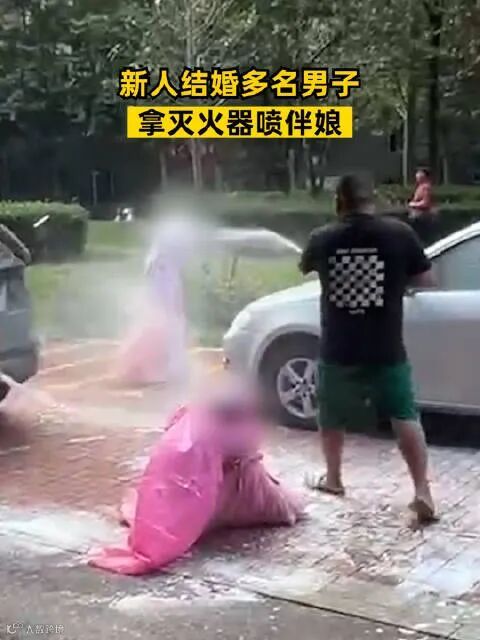 几名男子举起灭火器对着一名伴娘开喷
