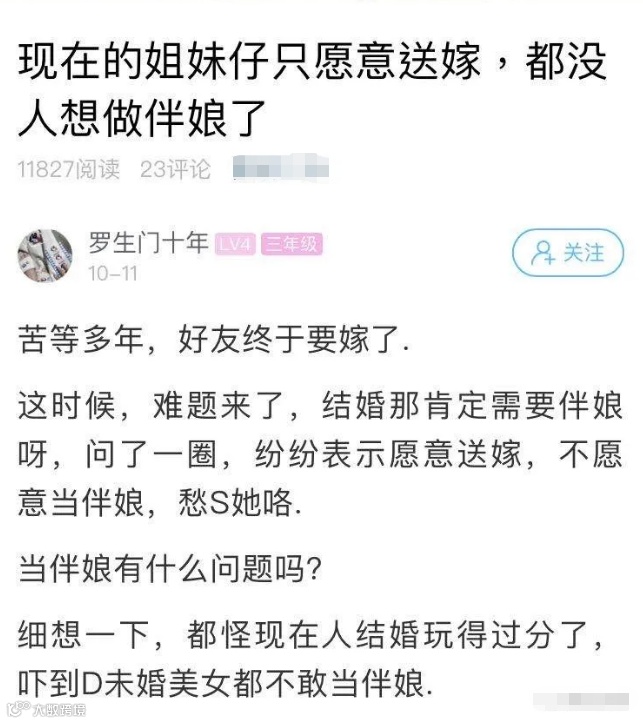 大多数不愿意当伴娘。”