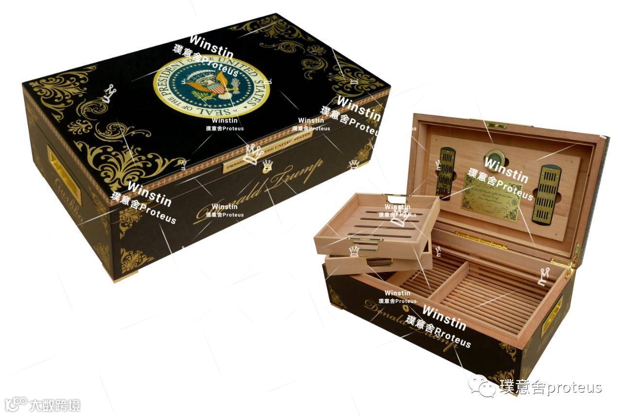 雪茄盒上盖的美国总统徽章,采用实木镶嵌工艺拼接而成;整个使用木材微小零件计数百片镶连。盒身混搭多款贝壳,加以纯金点缀,塑造出与众不同的设计,突出特朗普总统奢华而又不失高贵的品质。
