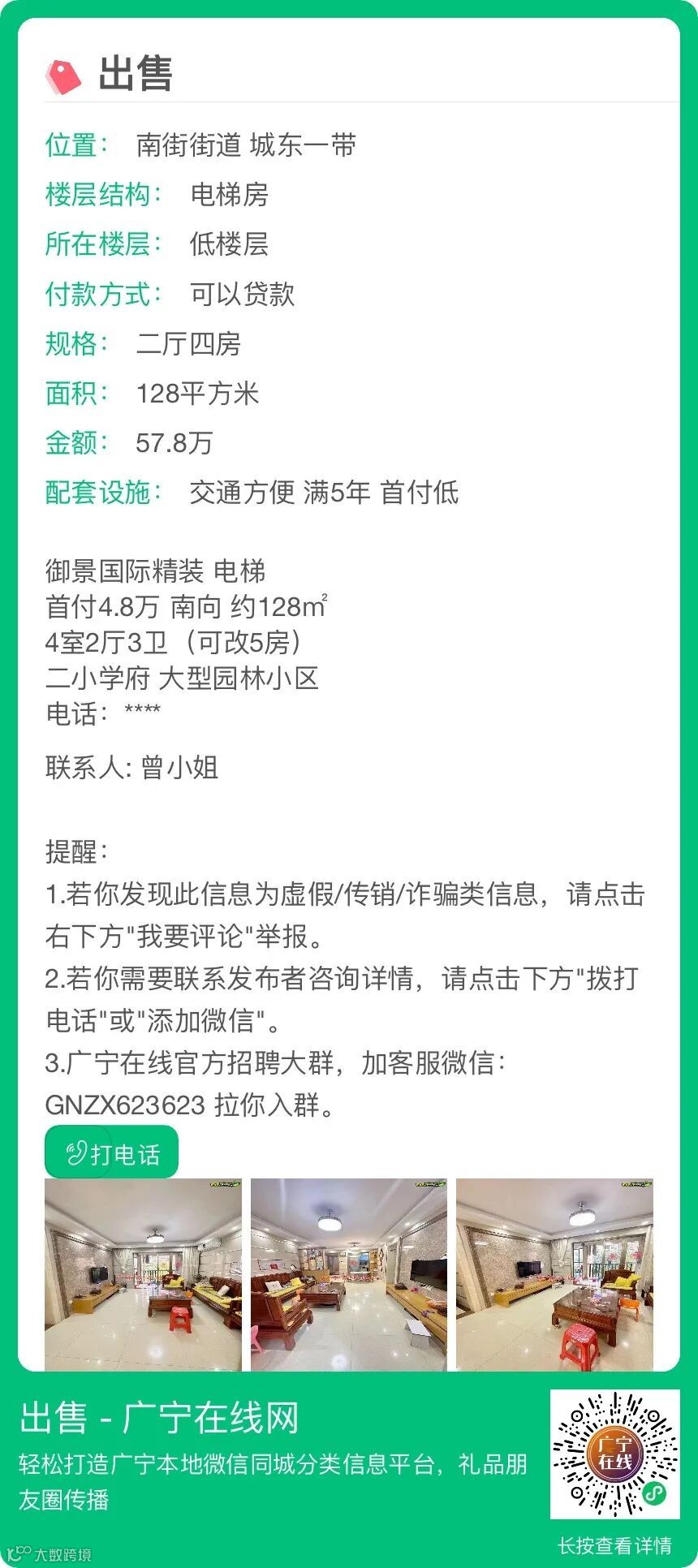 【57.8万出售】广宁御景国际精装 电梯首付4.8万 南向 约128㎡4室2厅3卫(可改5房)