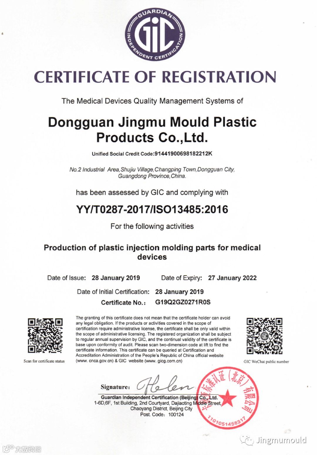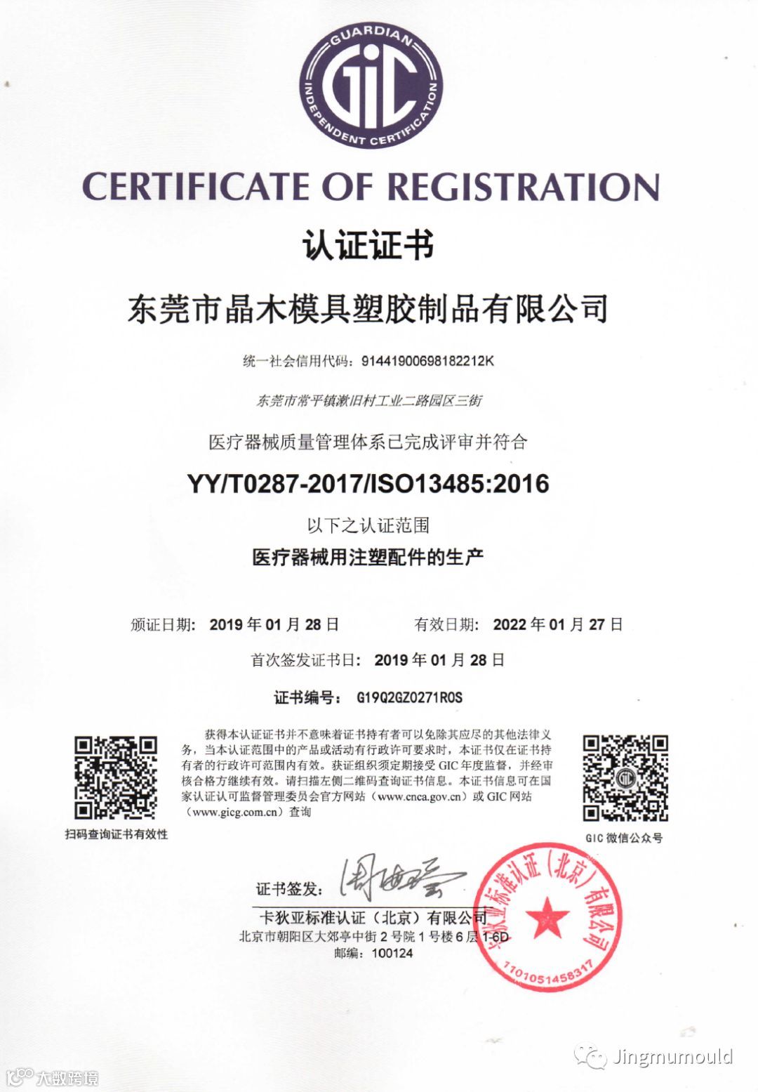 2019年1月,晶木模具获得了卡狄亚标准认证(北京)有限公司YY/T0287-2017 /ISO 13485:2016 医疗器械质量管理体系认证。