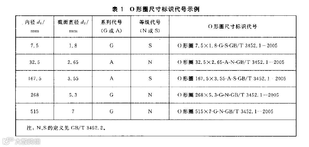 根据 GB/ T3452.2部分,符合A系列或G系列的O形圈 ,尺寸标识代号应以 内径 d1,截面直径 d2,系列代号( G 或 A) 和等级代号( N 和 S) 标明。