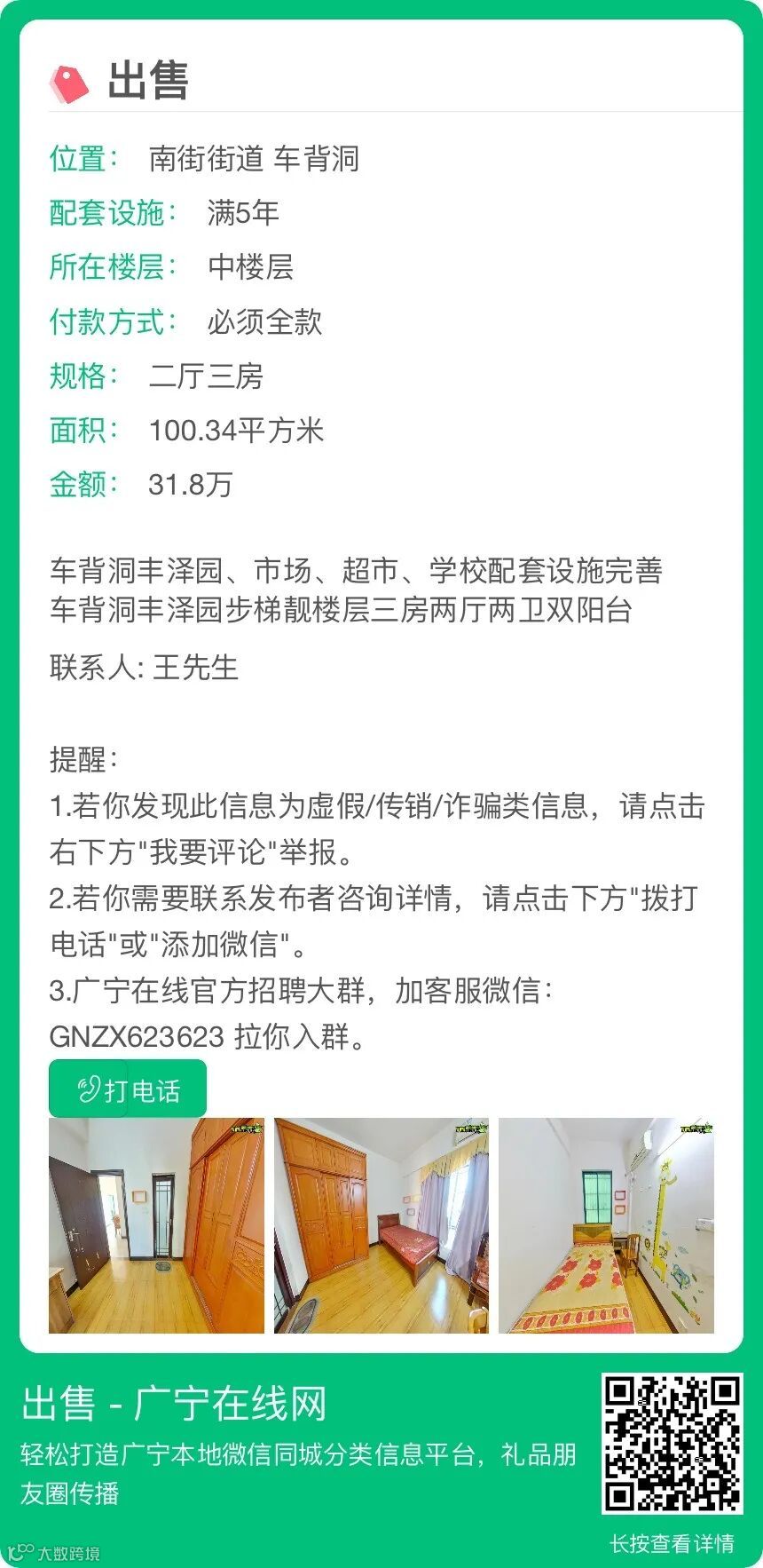 【31.8万出售】广宁丰泽园配套设施完善,步梯靓楼层三房两厅两卫双阳
