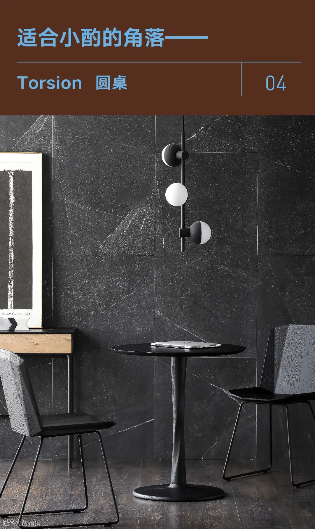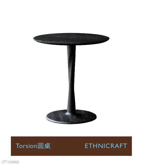 假如你在寻找一张小茶桌,这张来自比利时ETHNICRAFT出品的Torsion圆桌是不错的选择。在其黑色的外表下,结构简洁精确,旋切式的中央支腿,仿佛雕塑般矗立在空间中,神秘且优雅。