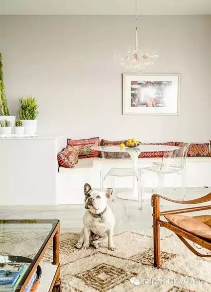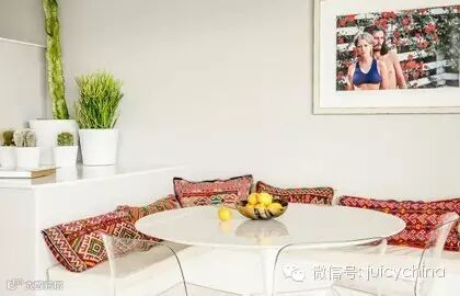 餐厅里多彩的复古枕头和全白的环境相对比。