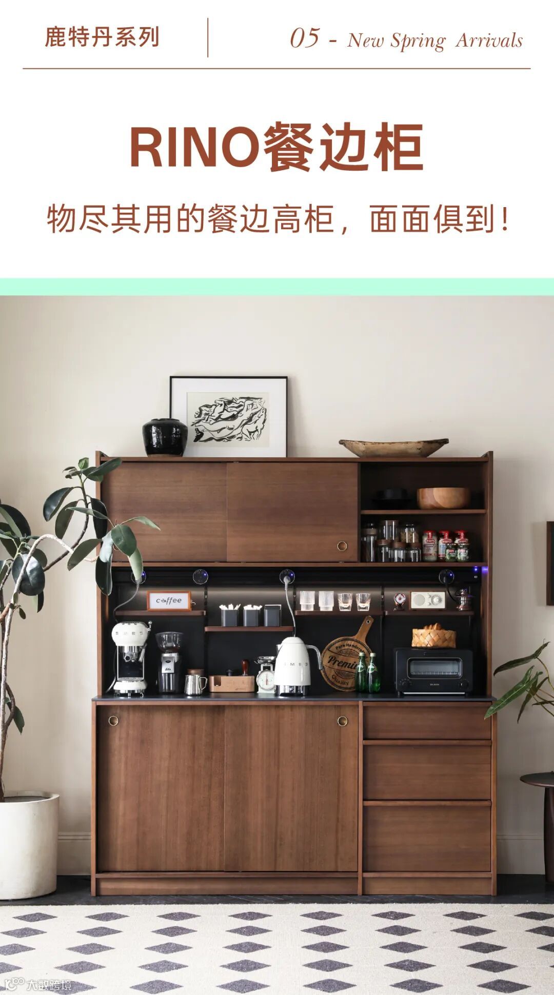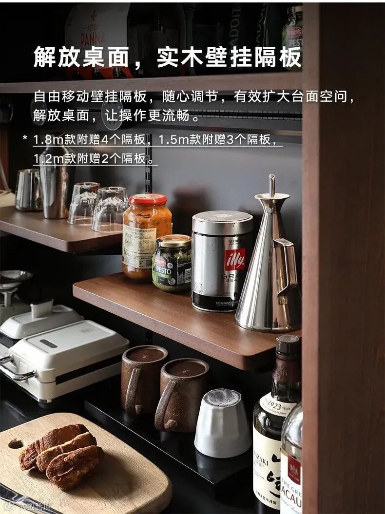 假如你家缺少收纳区,千万不要放过家里的那面白墙。这款餐边高柜选用优质的玫瑰木,充分利用了垂直空间,移门储物柜+超大的操作台面+活动隔板组合,主打一个科学精细化收纳,物尽其用,日常利用率非常高。