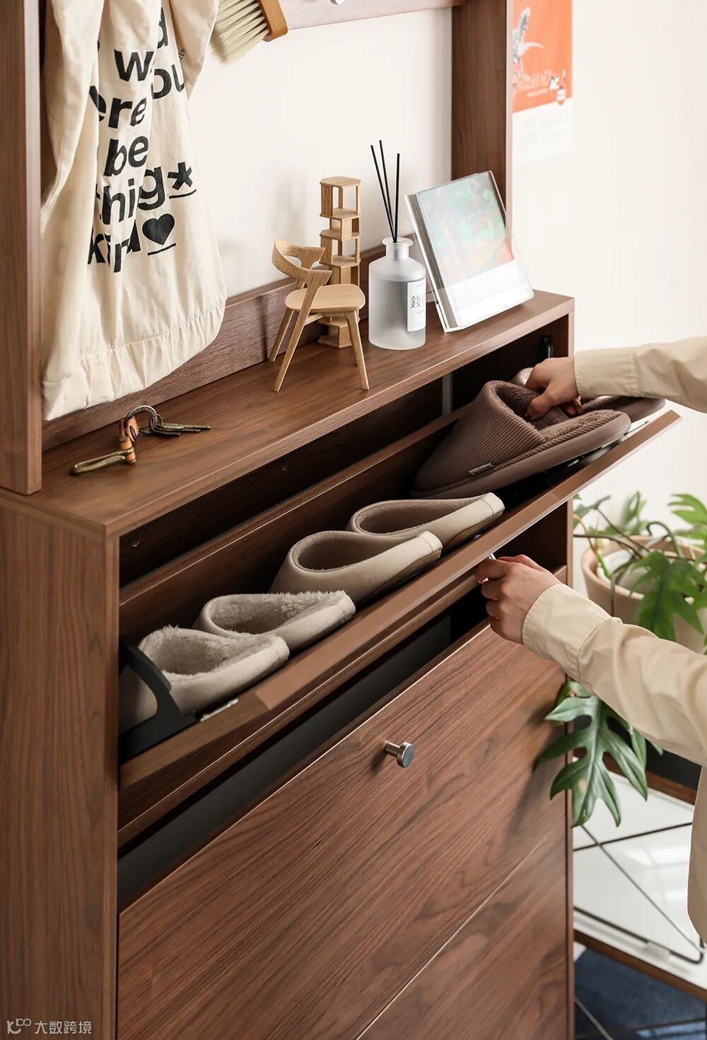 17cm超薄设计,占地不足0.2㎡,窄过道也能拥有。上层是8个挂钩+1个台面,把钥匙、雨伞、帽子、耳机甚至是遛狗绳都安排的妥妥当当。下层是翻斗鞋柜,开合顺滑,拿取轻松,可轻松收纳9-12双鞋。