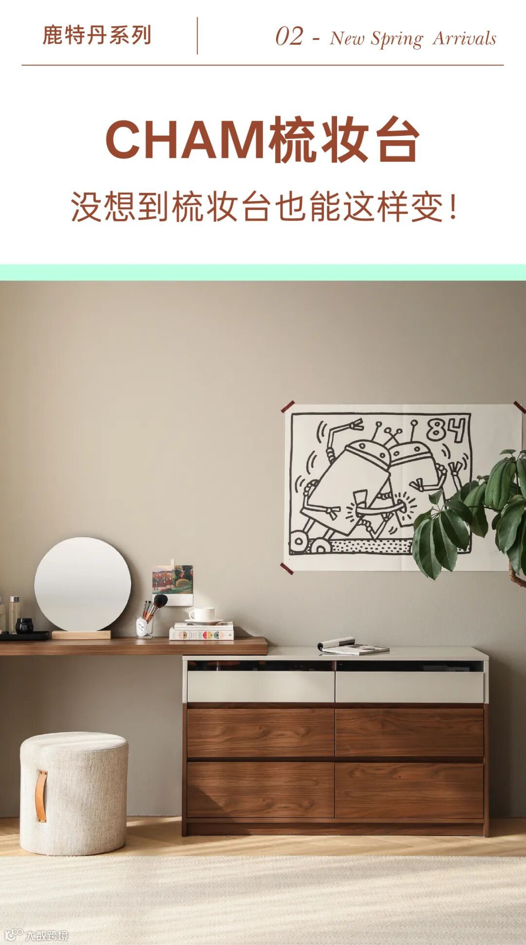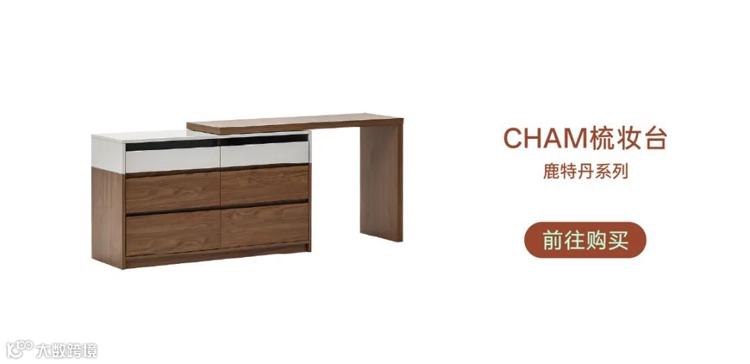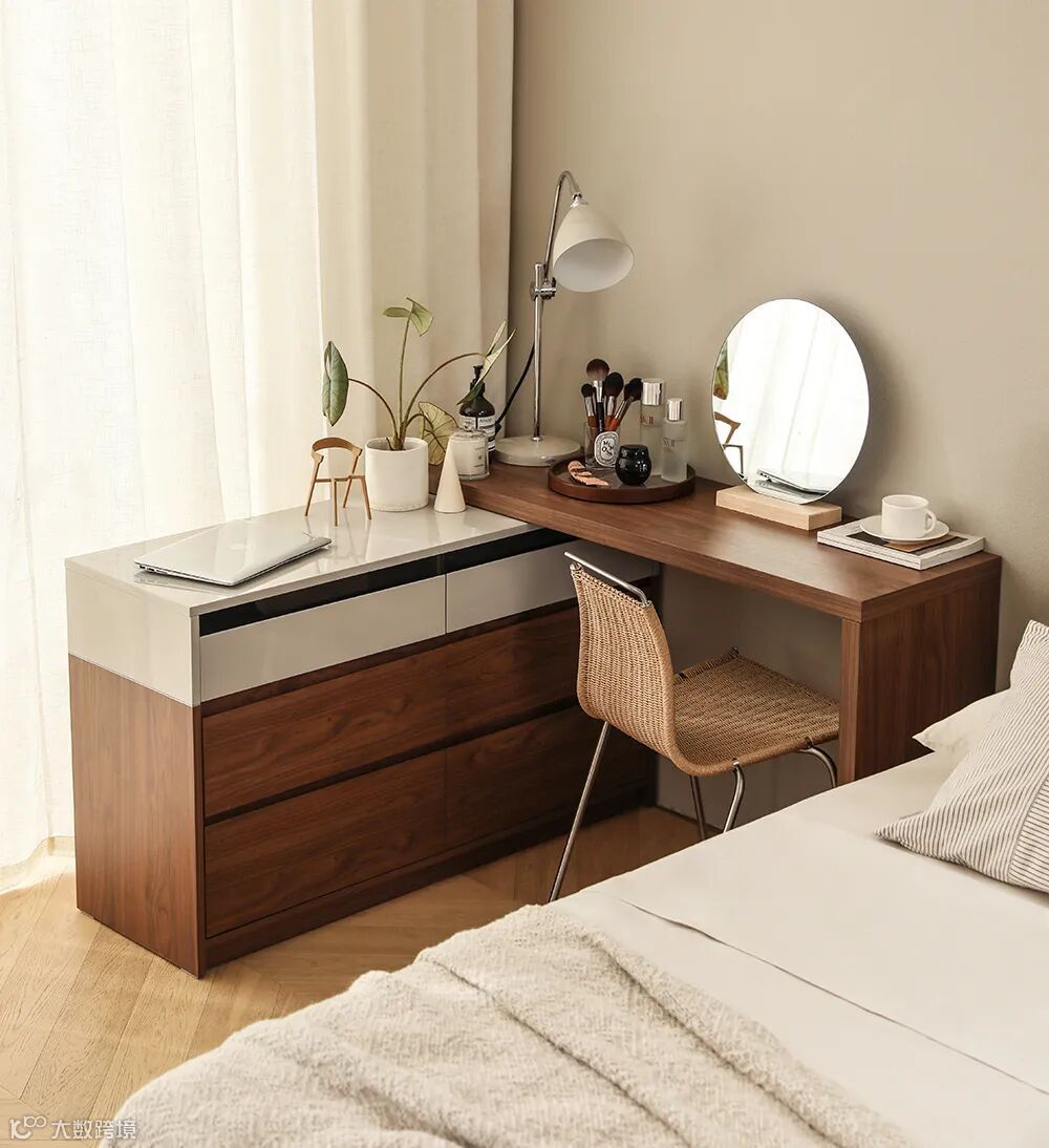 谁能想到,只是为梳妆台增加一个活动锚点,就能为小户型卧室格局打开思路。这种巧妙且简洁的分体设计,不仅可以伸缩自如,还能根据需求自定义角度,让女生们能好好坐下来做个睡前护肤。