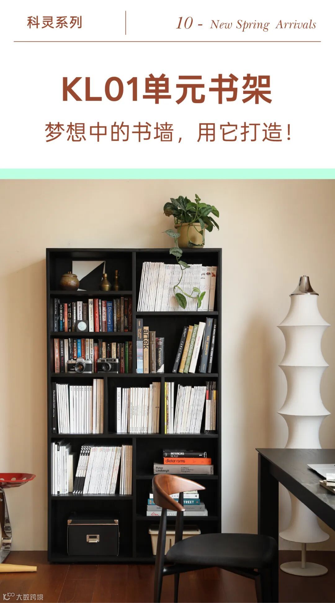 KL01书架,身形高挑简洁,可以多只联排,单格承重更是达到了50斤。其中隔层布局紧密有序,颇有章法:无论是小说或是艺术画册,都能尽数收归其中,好取好拿。