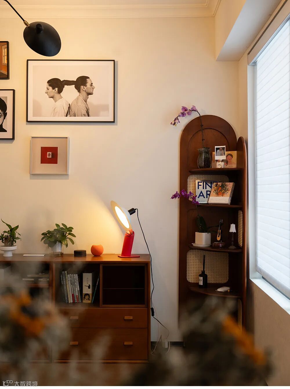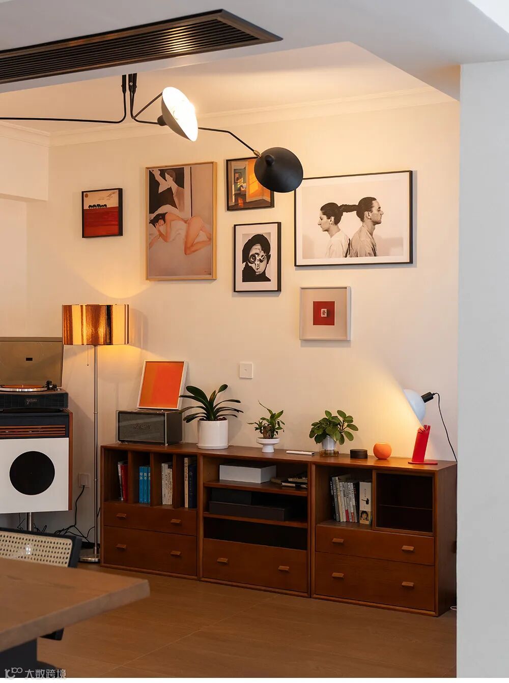 黑色的蜘蛛吊灯向四方延展探出,一只带着圆形大眼的角落中古柜上摆放着黑胶机,音乐在这个家里无处不在。墙上的装饰画正期待着主人在未来的日子里逐渐填满。跳动的红色块,像是节奏音符,唱响了这个家浪漫隽永的主旋律。