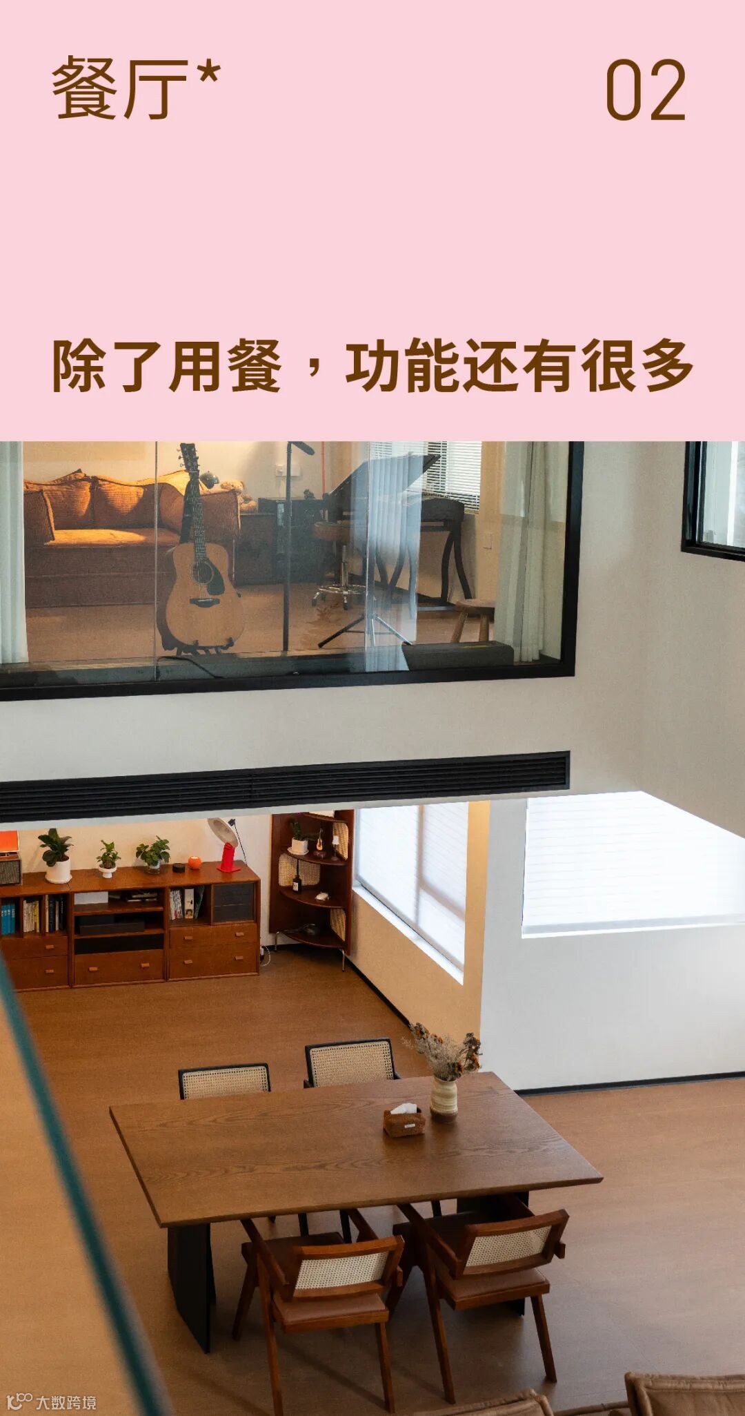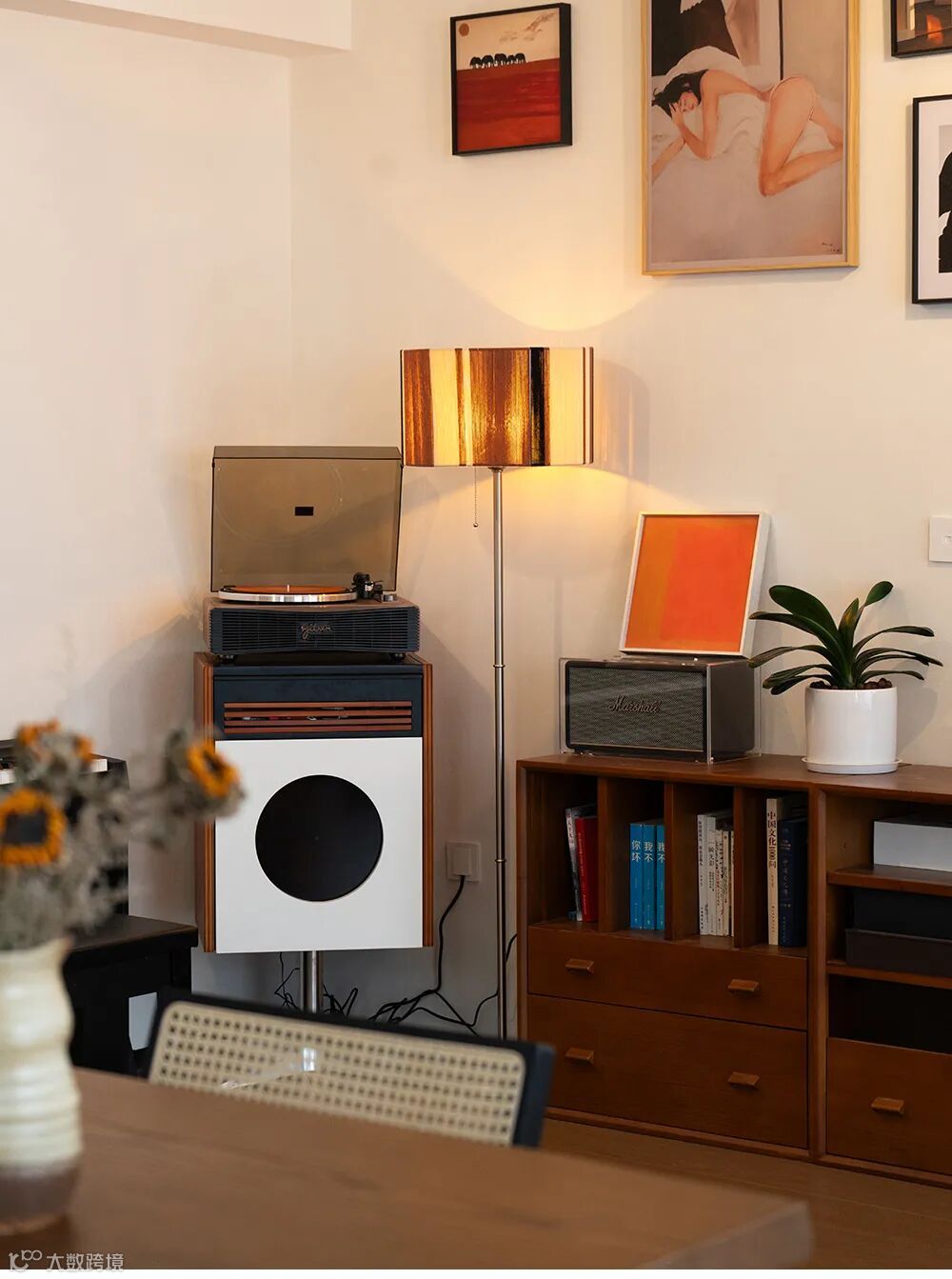 跨越方块沙发,就是传统餐厅,但这里更像是一个阅读区,一个DIY手工台,一个工作室,一个能享受音乐,营造温暖氛围的艺术角落。