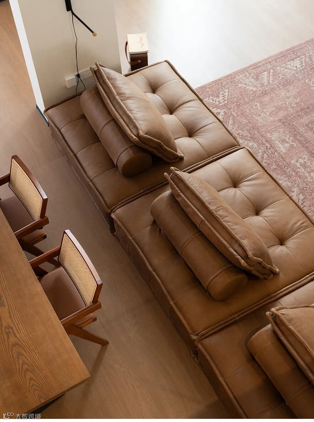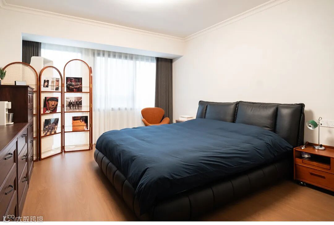 主卧沿续了蜂蜜棕的中古风格。柔软的黑色皮床自带两个巨大的靠枕,摆在空间正中。复古感十足的藤编屏风,既是空间中的隔断装饰,又是黑胶碟片的置放架。