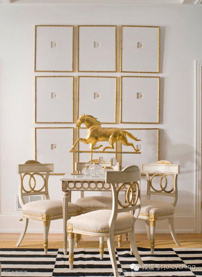 以白色和棕色为背景色,点缀高雅的金色。不论是座椅还是挂画使用金色作为装饰,都会提升家居的优雅感觉。