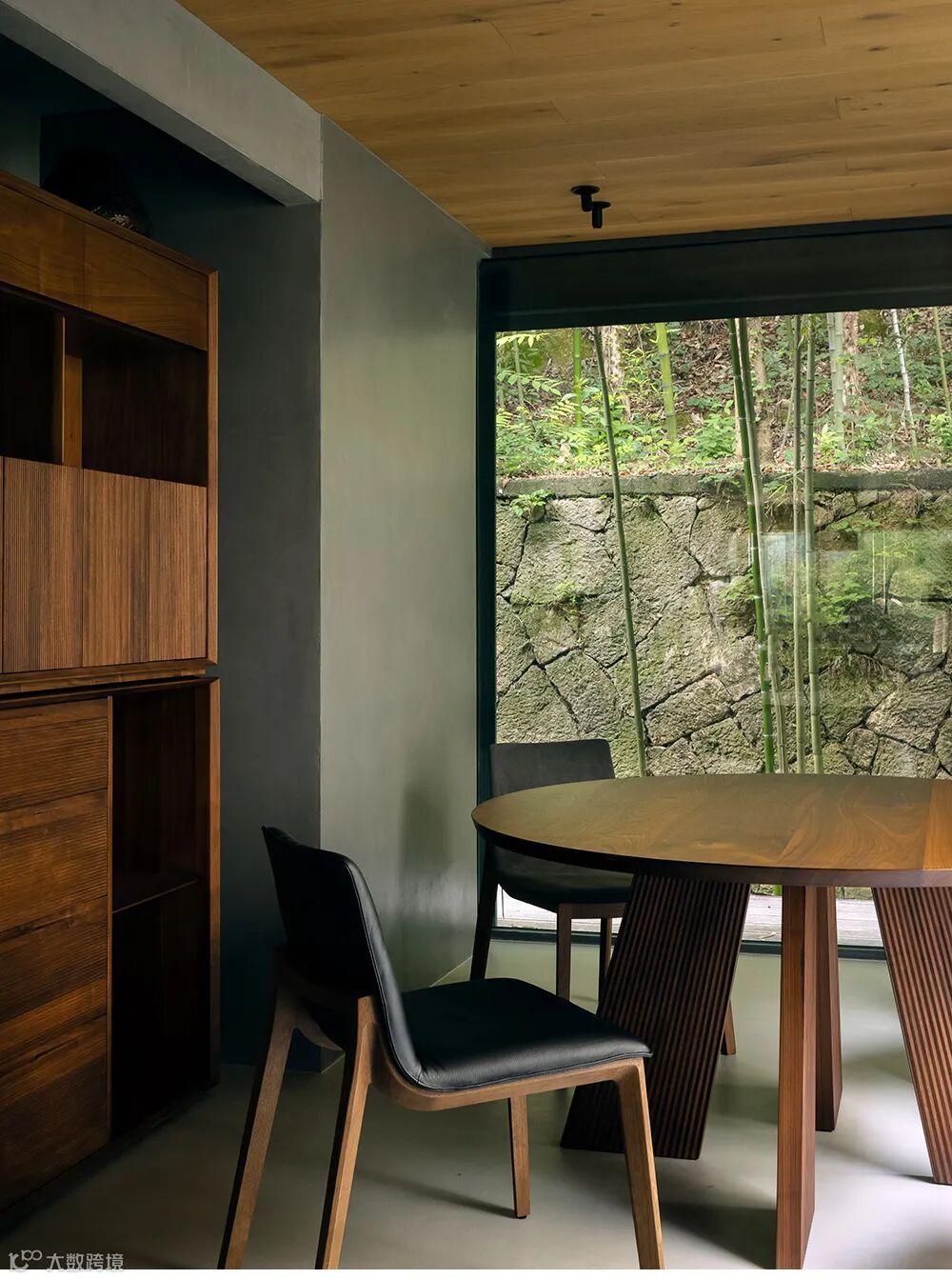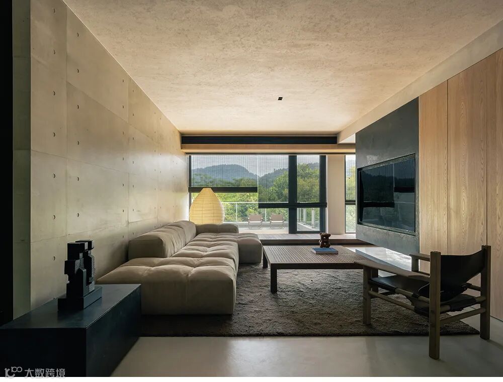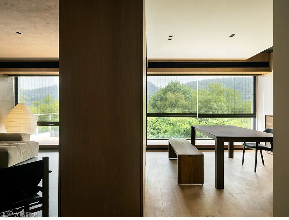 大面积的实木与干净的混凝土,让这里变得宁静且从容。三面巨大的落地窗,像画框般,收藏着大山里四季的流转。