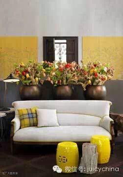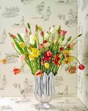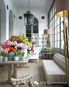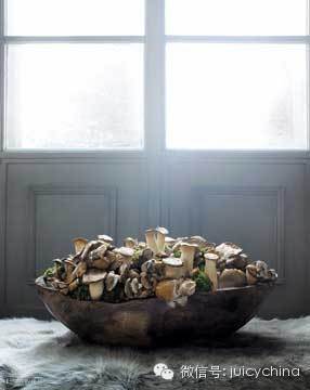 花艺是她设计的绝对亮点,她擅长在花材和花器上做突破,比如她会摆一盆蘑菇、会在彩色的鲜花里插入木棍。还会运用新鲜的水果做装饰,最特别的她采用了具积极东方气质的水仙花。