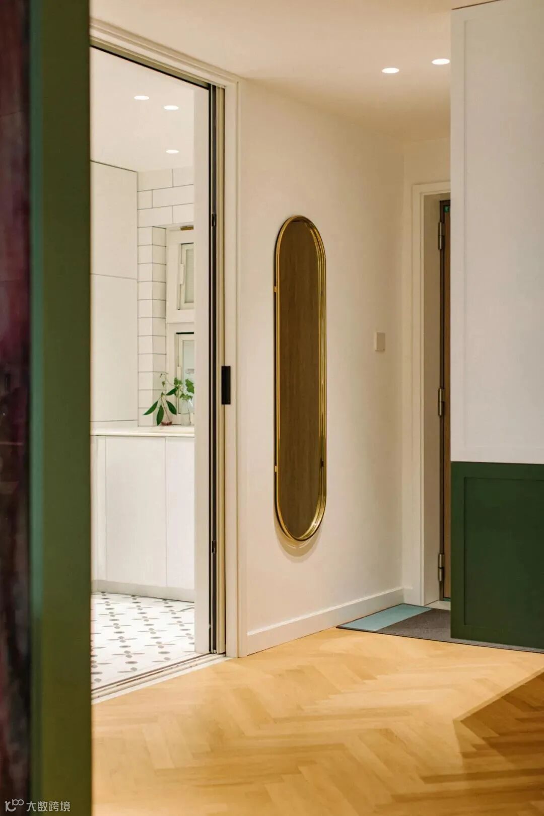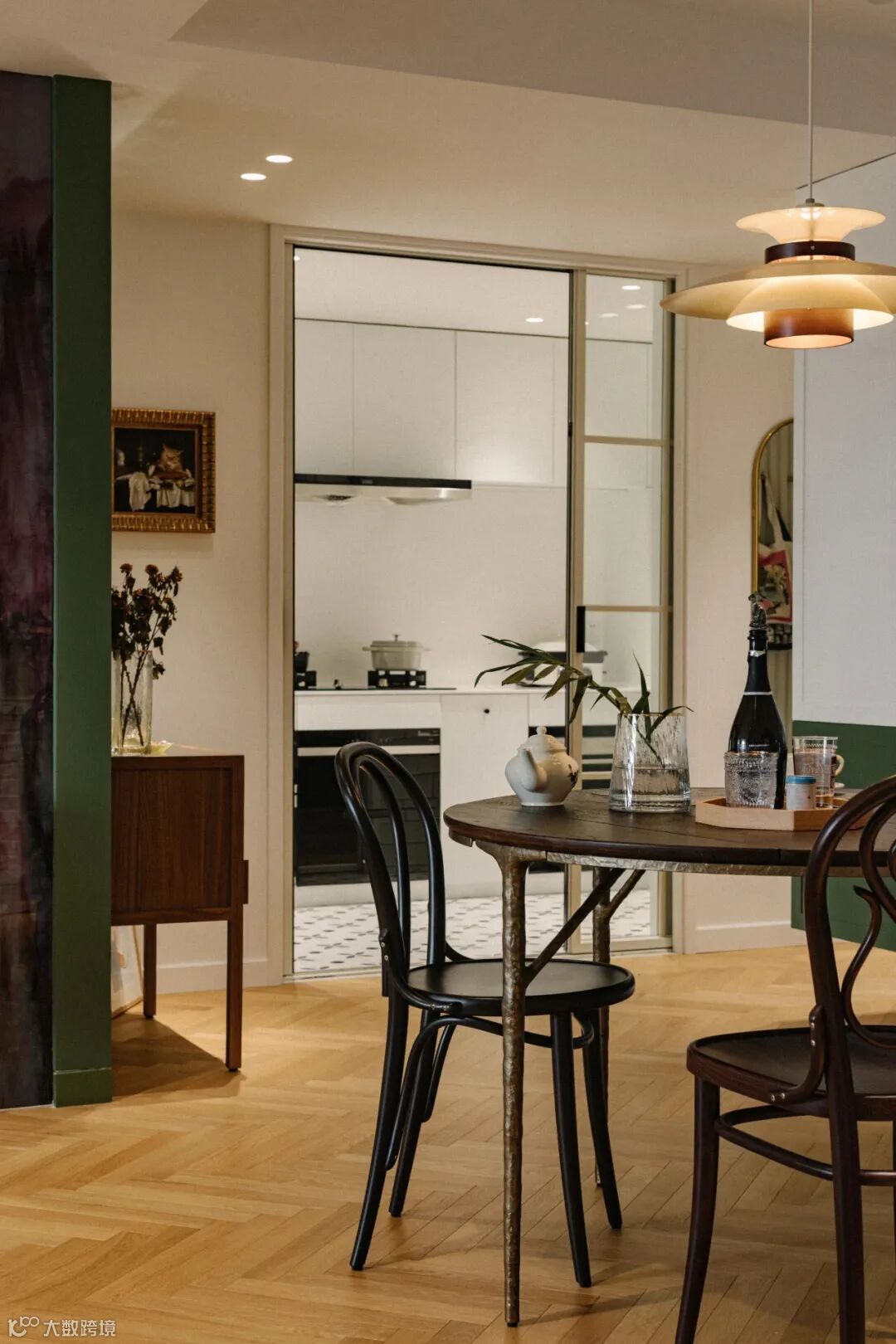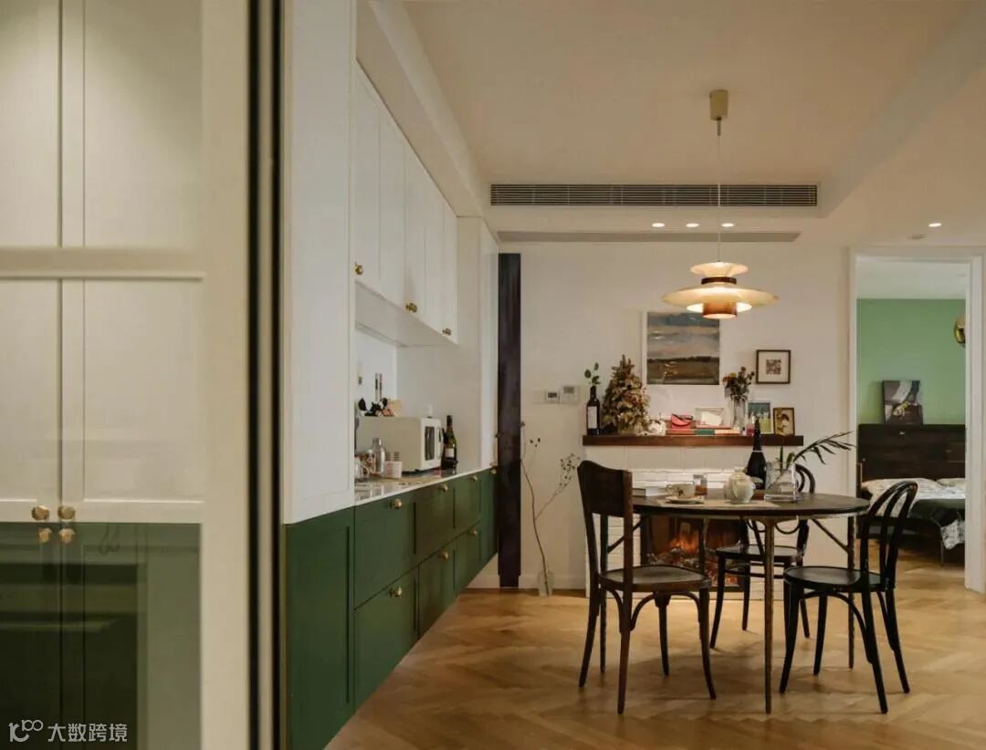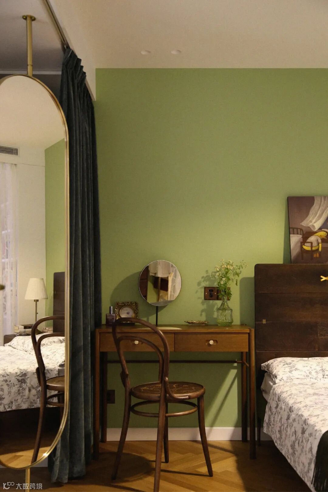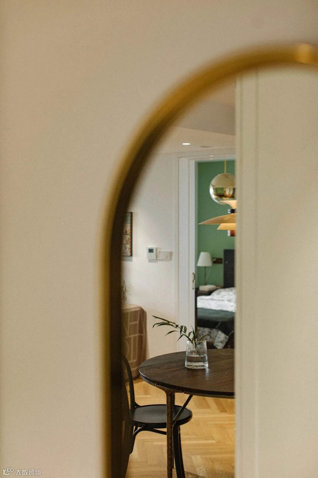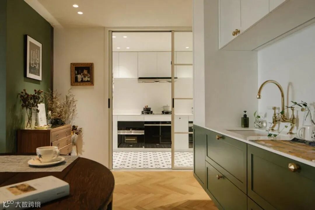 厨房与玄关的交界地带安装了一面金属穿衣镜,金色与墨绿可谓打造复古风的绝配,镜头推近,餐厅与卧室空间在此处依次交叠。