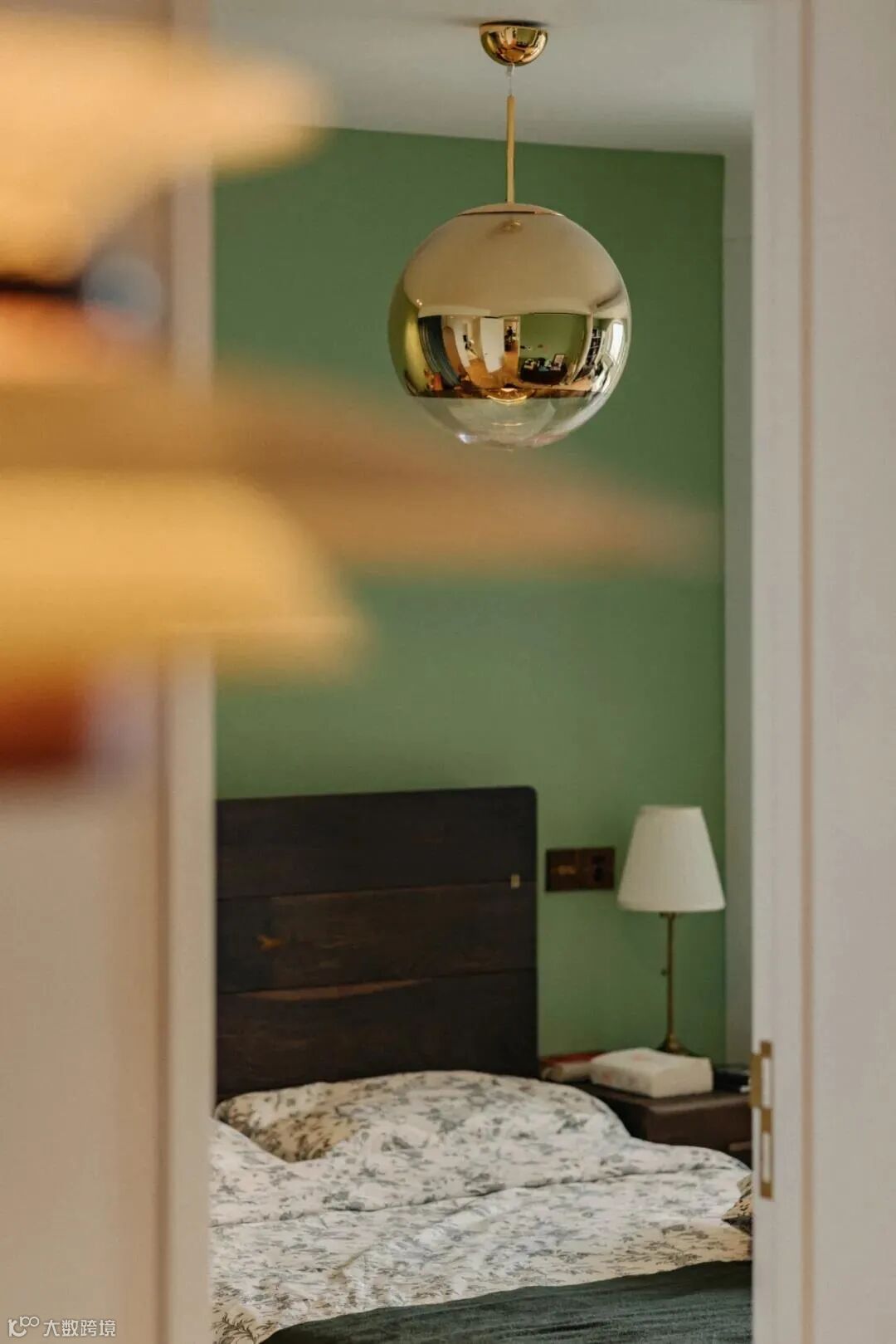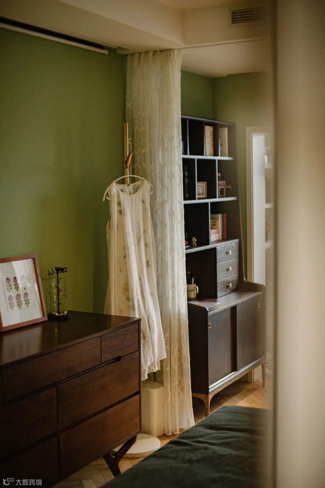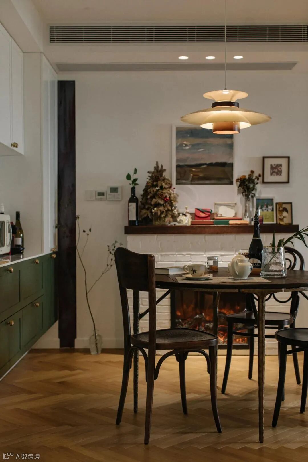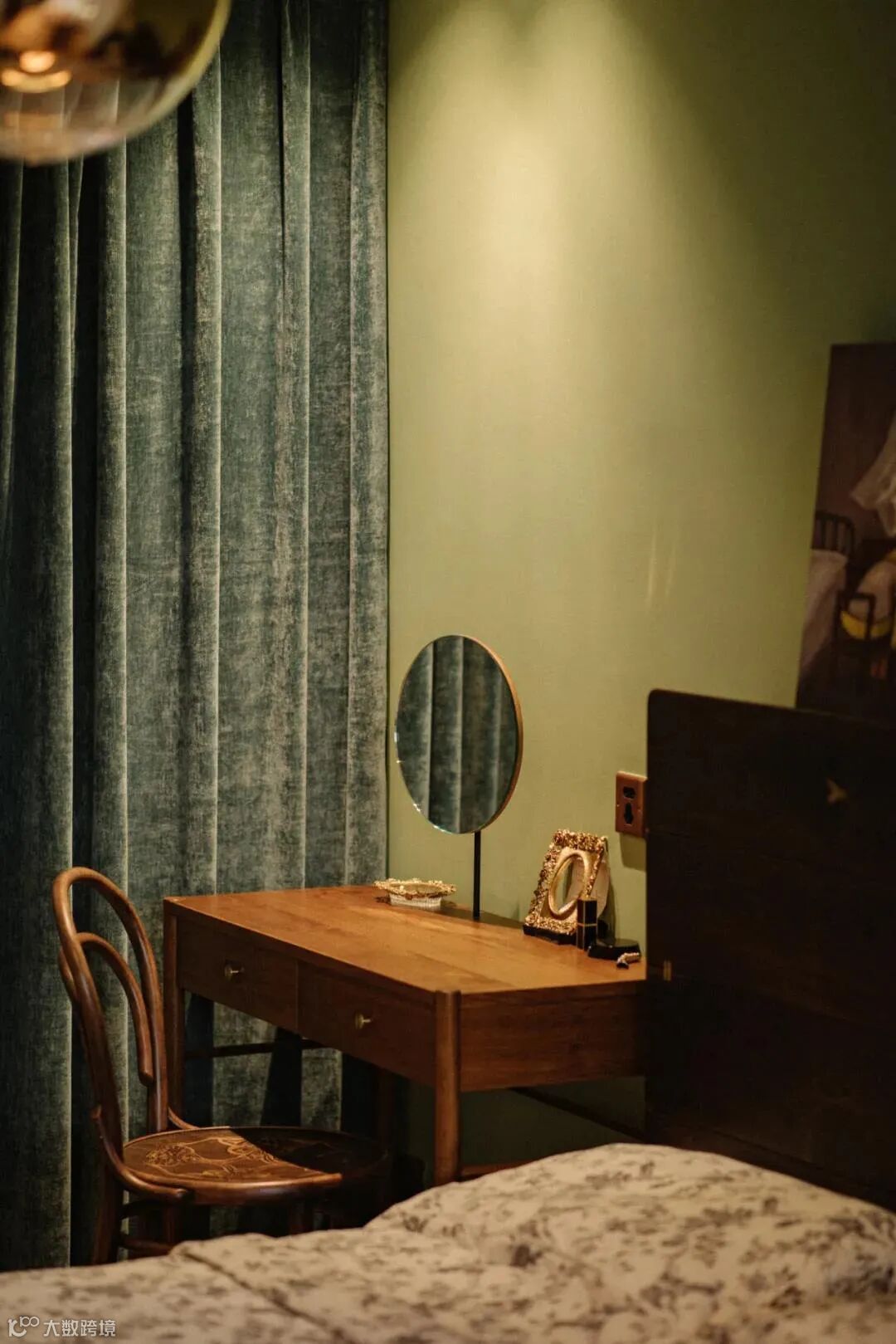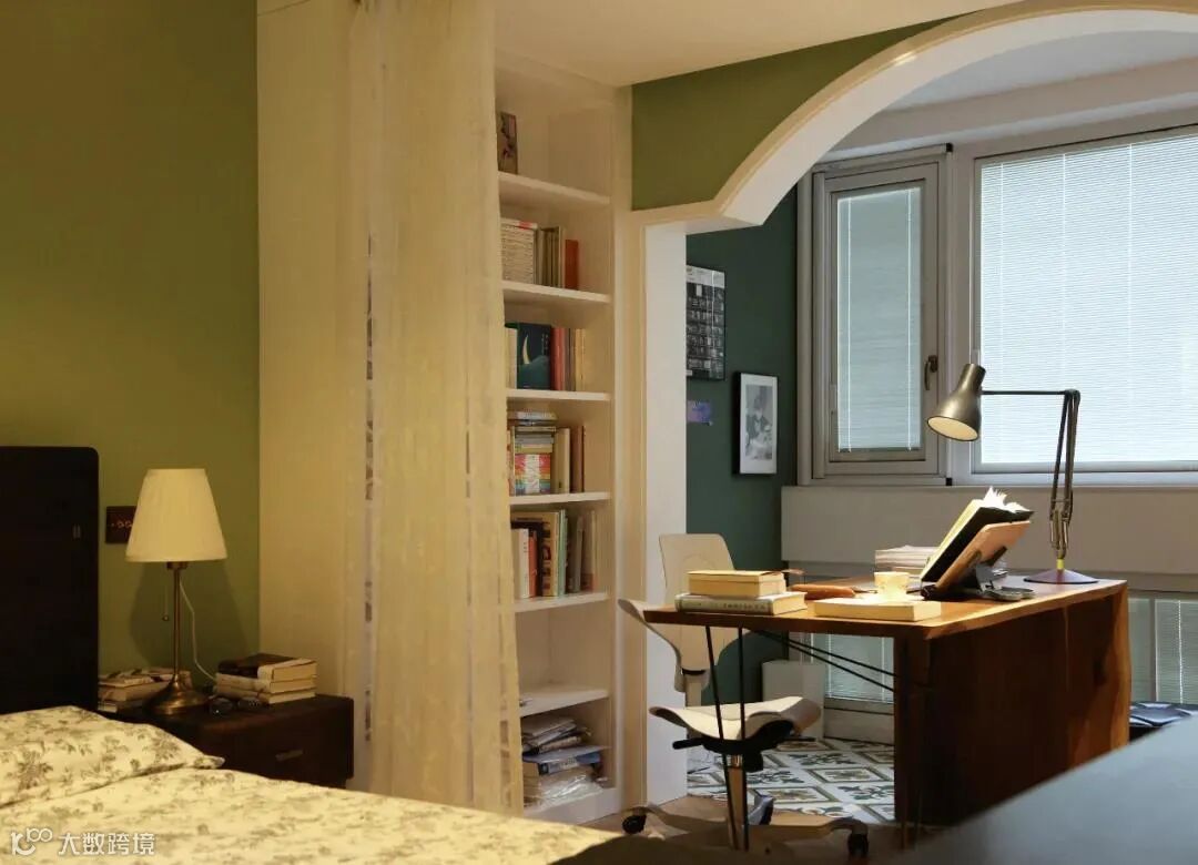 厨房与玄关的交界地带安装了一面金属穿衣镜,金色与墨绿可谓打造复古风的绝配,镜头推近,餐厅与卧室空间在此处依次交叠。