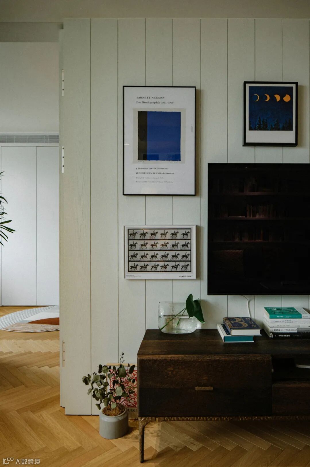 在电视墙一侧通过隐形门可进入多功能房,置于此处的ROOT&BRANCH电视柜默默散发着烟熏橡木的神秘气息和金属腿雕塑般嶙峋的美感。