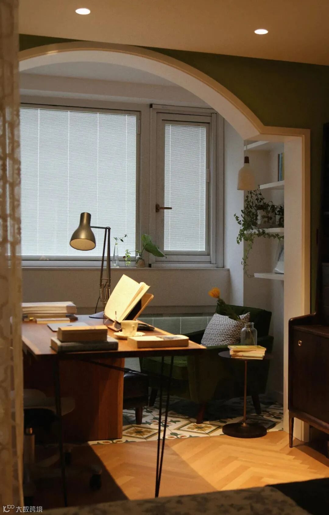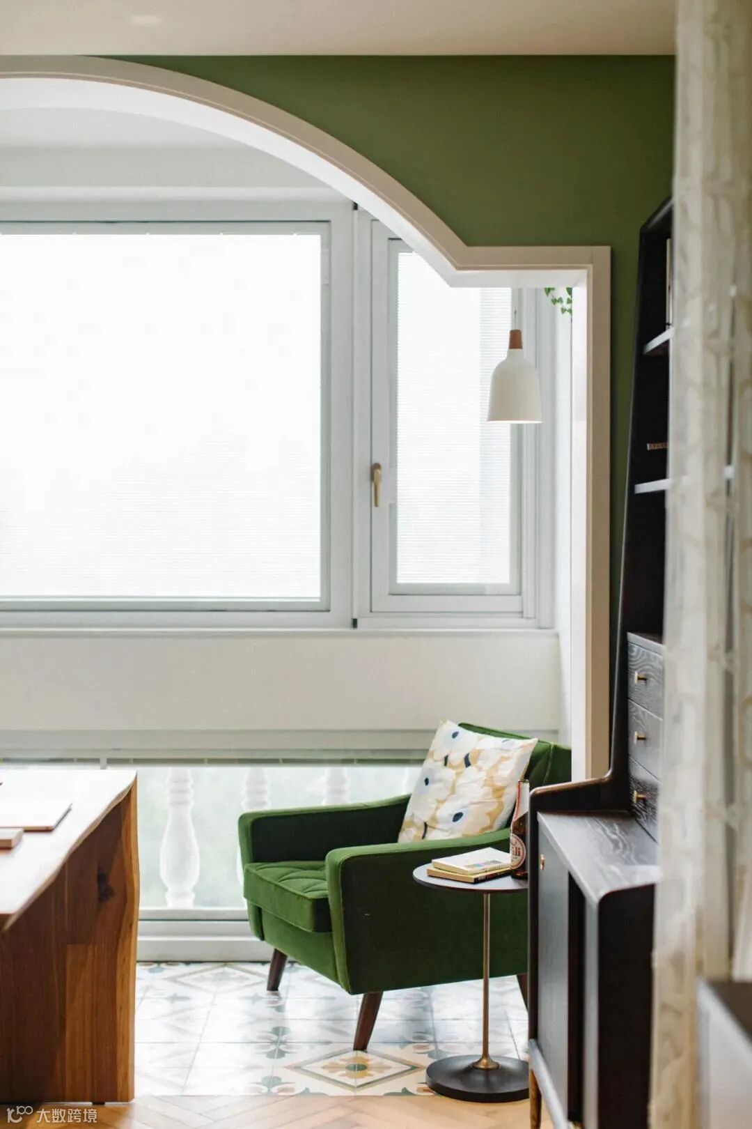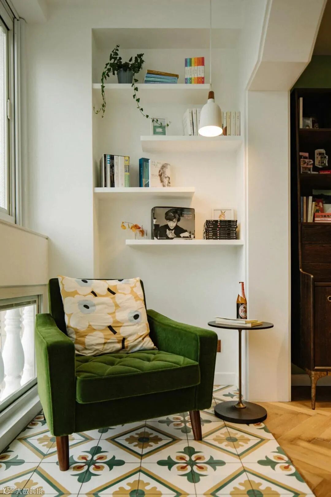 阳台休闲区,设计了交错的置物架,一侧的吊灯可以在晚上为阅读提供灯光。复古水泥花砖再次呼应了整体的绿色调,令人在不觉间身心舒缓。