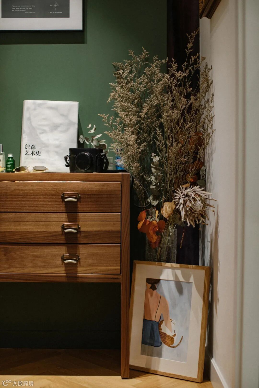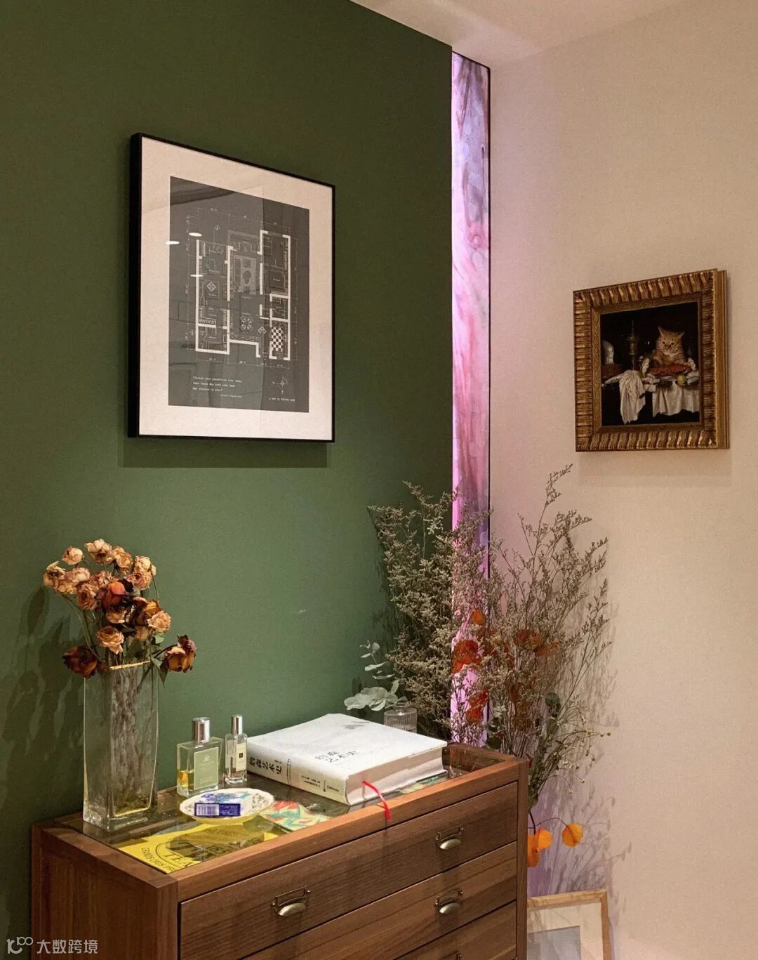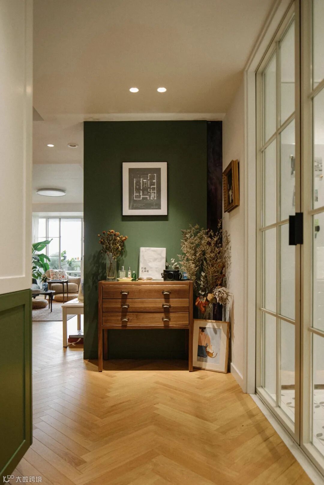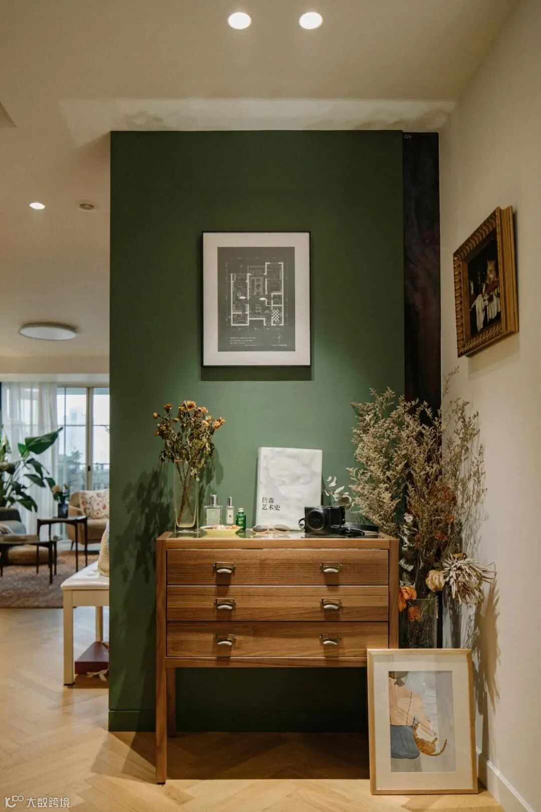 绿色背景墙的掩映下,摆放在玄关尽头的记录者收纳柜,与花束、装饰画和温馨的灯光,聚集成每一次归家时刻的仪式感。