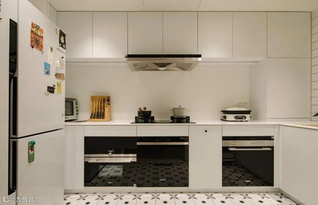 进门右侧即是厨房,以明亮洁净的白色调铺陈,地面瓷砖的树叶纹理生动呼应了屋内的绿色元素。