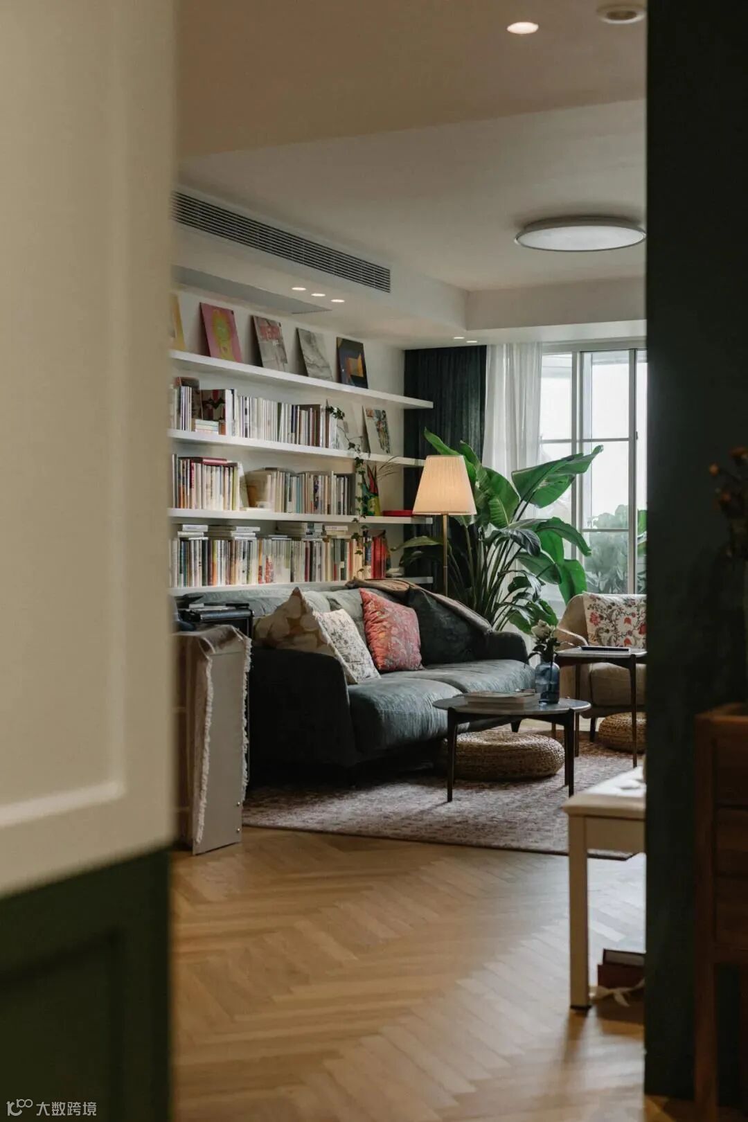 客厅书架采用了悬挑板的形式,错落陈列的书籍成为了最佳的客厅背景。从玻璃移门外涌入的自然光线在MARM
