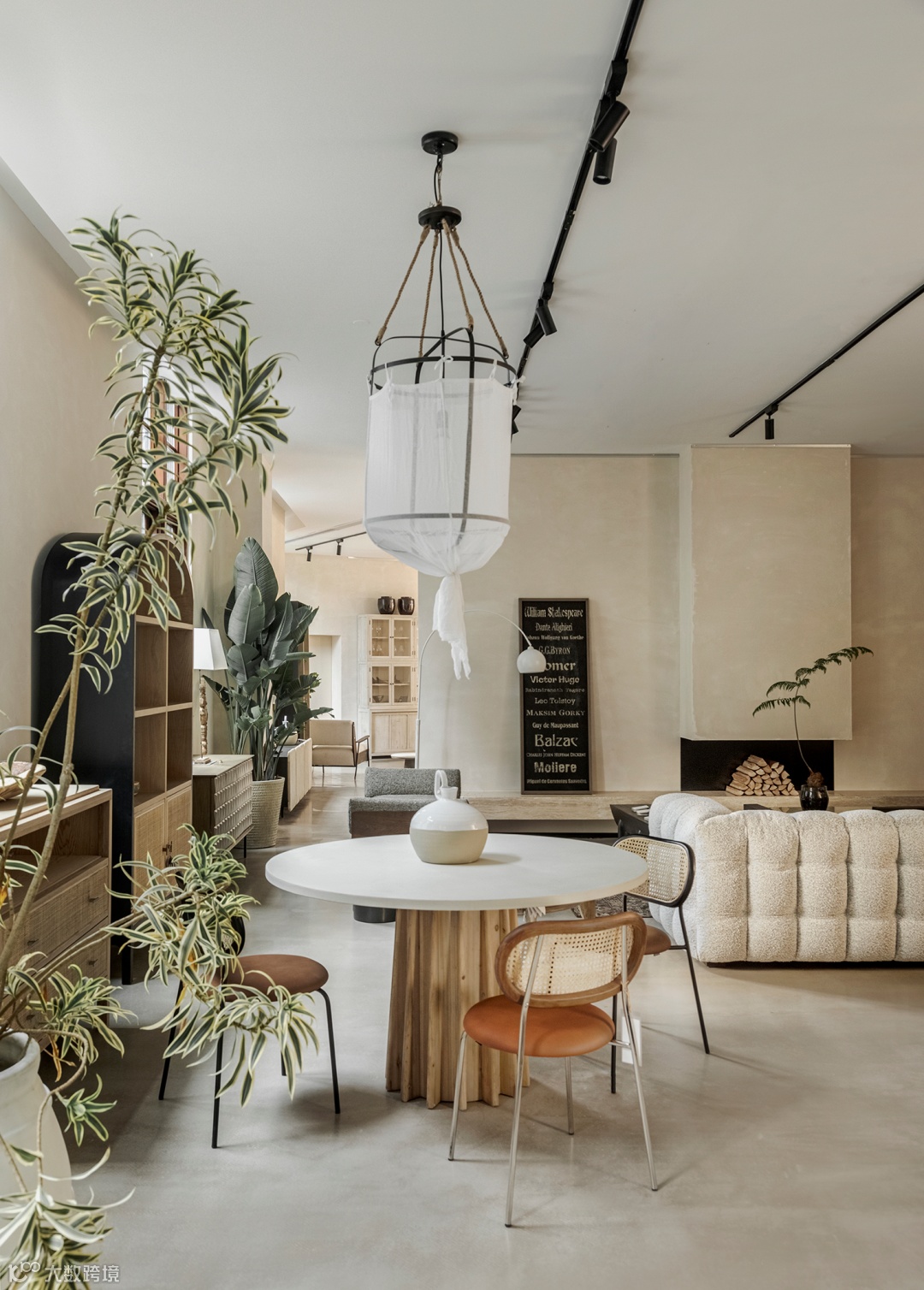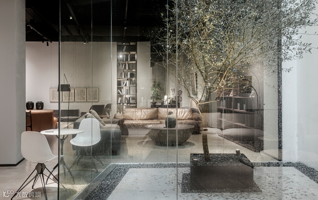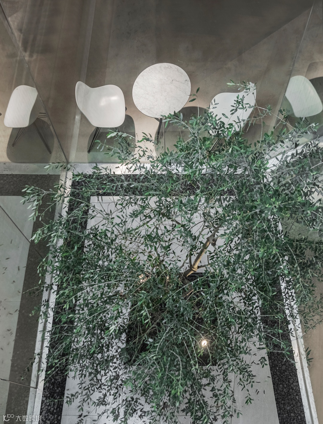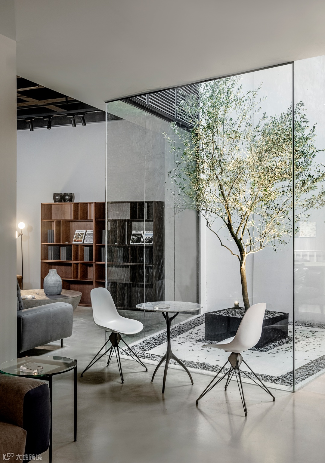 中庭区域,将天光引入,空间与材质配合借景,用绿植创造出一个半环绕式的空间,引导流线向更深处前进。同时增加中央区域的通透性,缓解人游走过程中的疲惫感。
