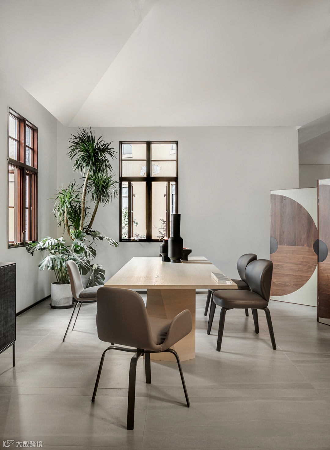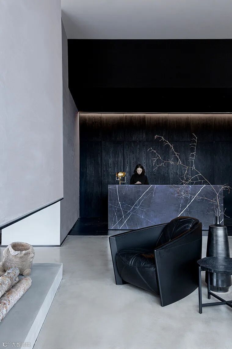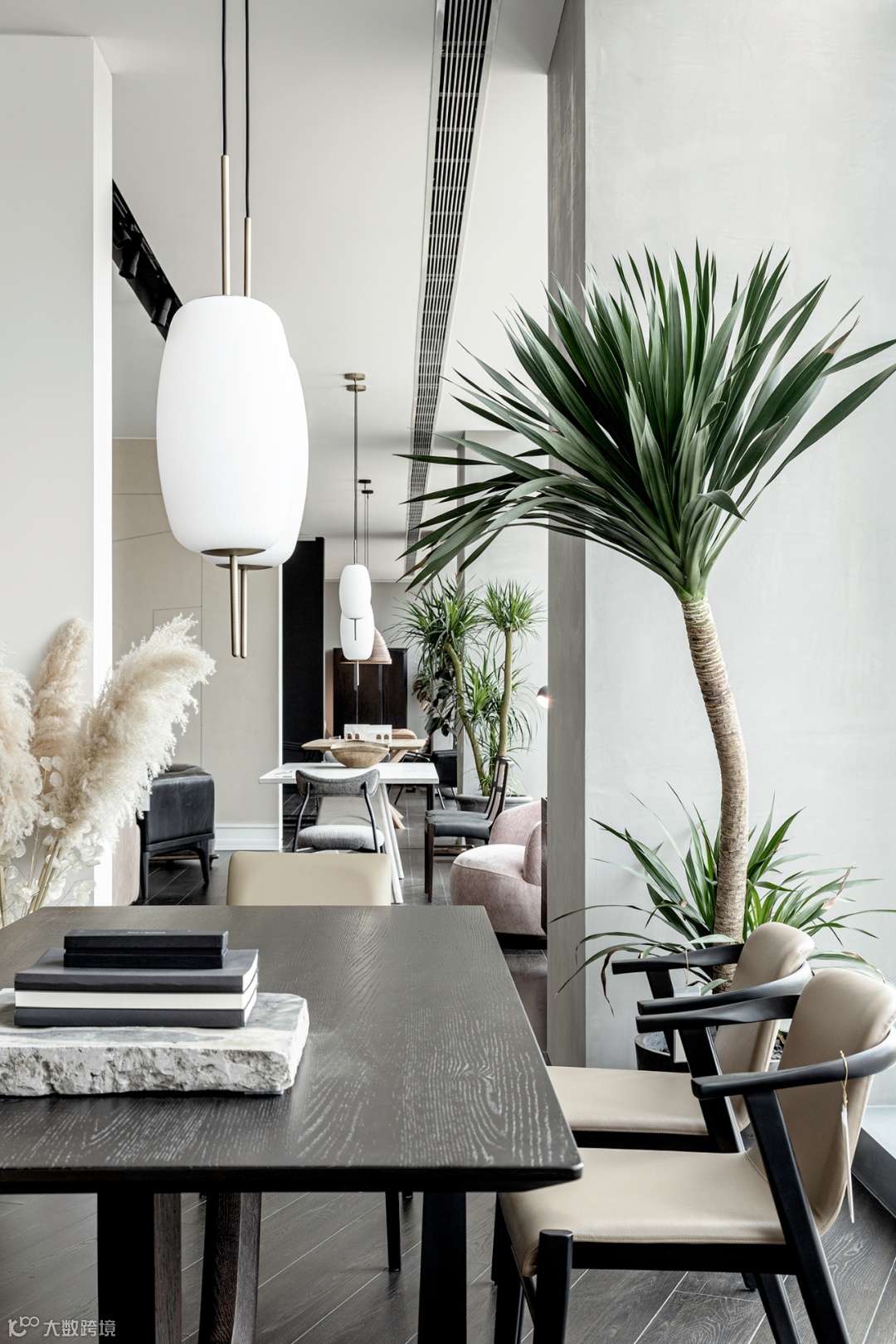 中庭区域,将天光引入,空间与材质配合借景,用绿植创造出一个半环绕式的空间,引导流线向更深处前进。同时增加中央区域的通透性,缓解人游走过程中的疲惫感。