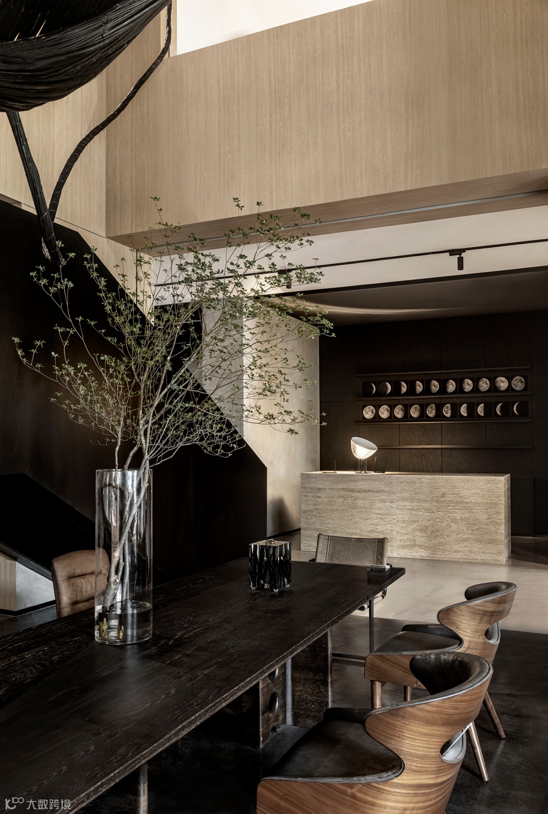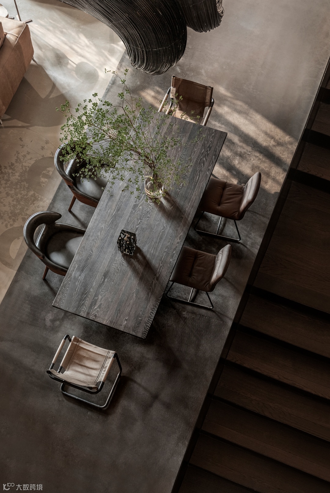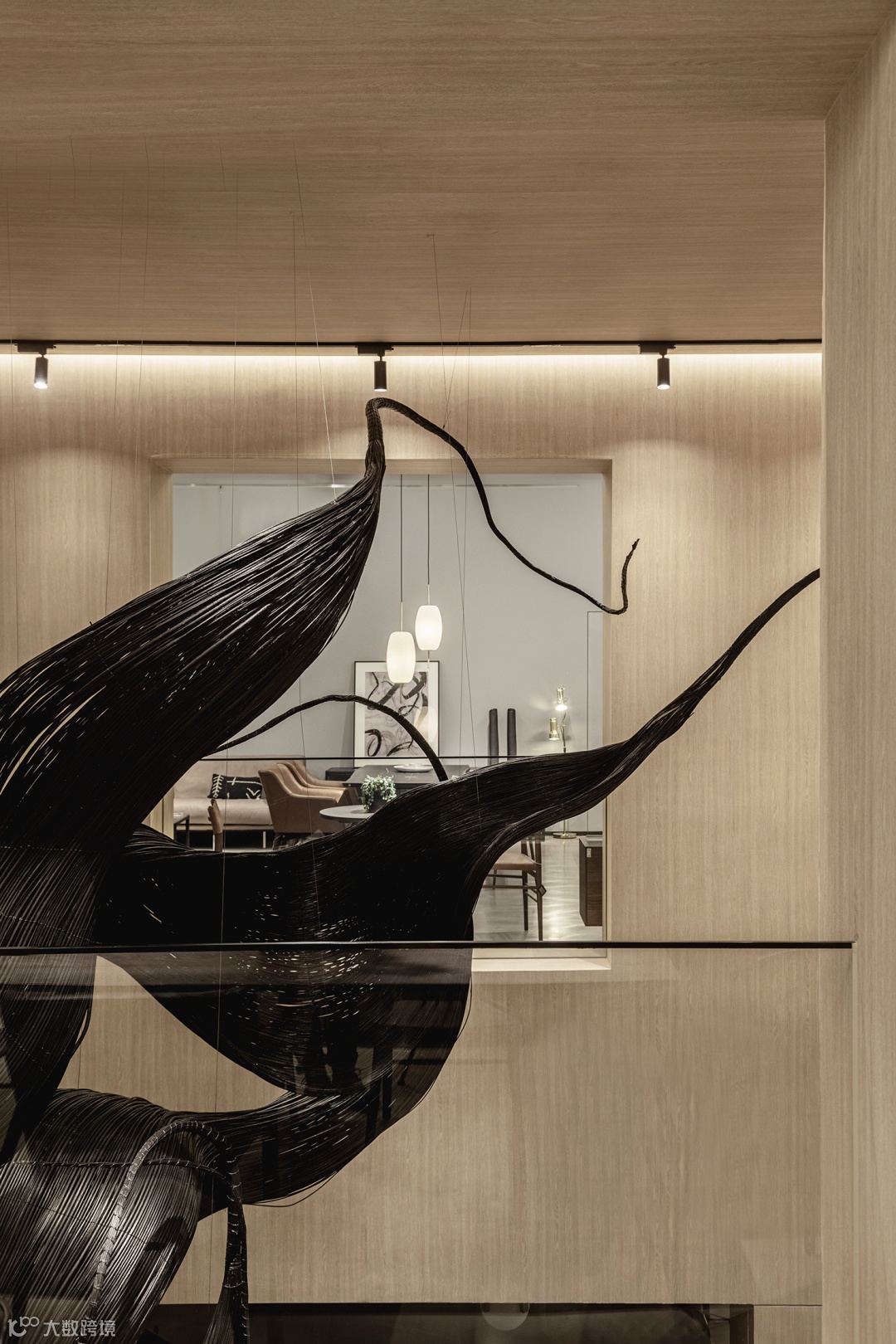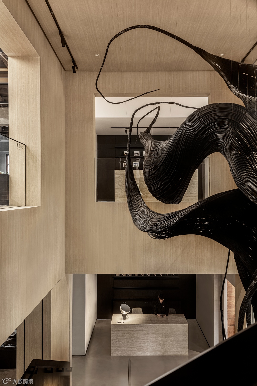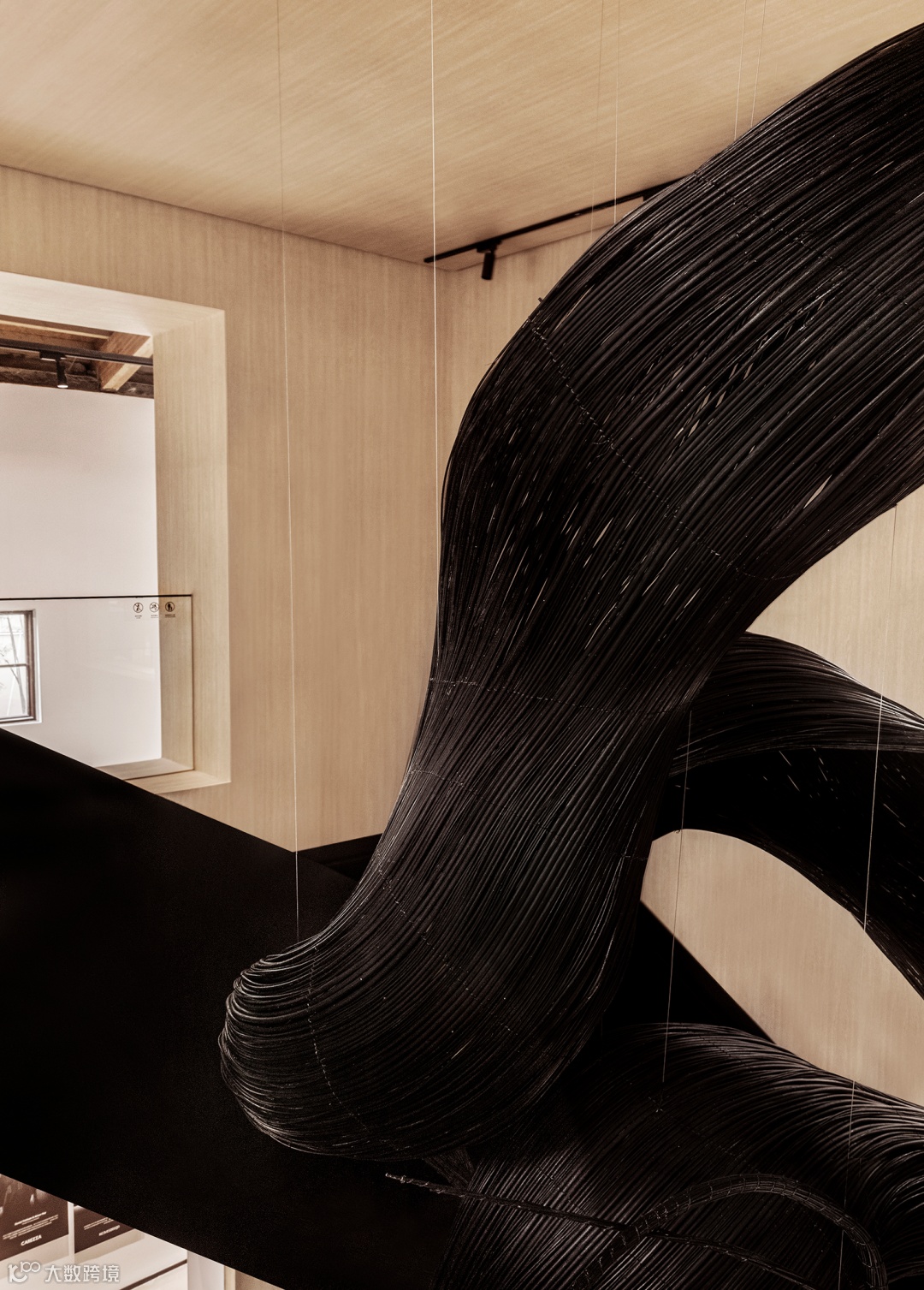楼梯区域上方的简洁空间,盛开着一朵以黑色藤条为媒介的抽象的花,曲线形的姿态柔化融合了上下空间。与GR ATR 合作的空间艺术装置意为“每个人都是世界上唯一的花”,愿将饱含希望的、柔软舒适的感受传递给每一个人。