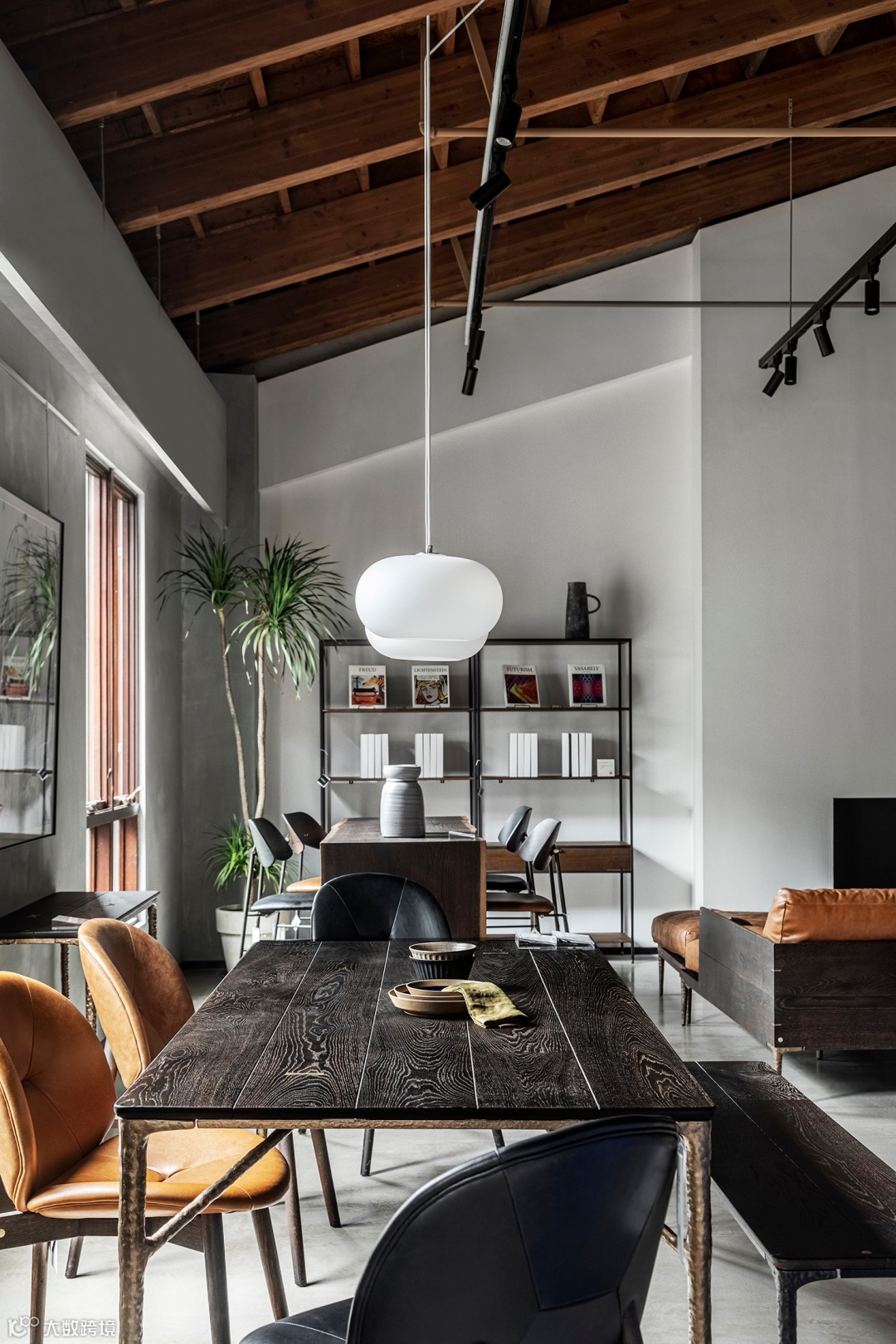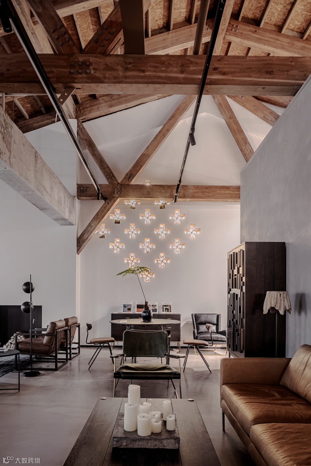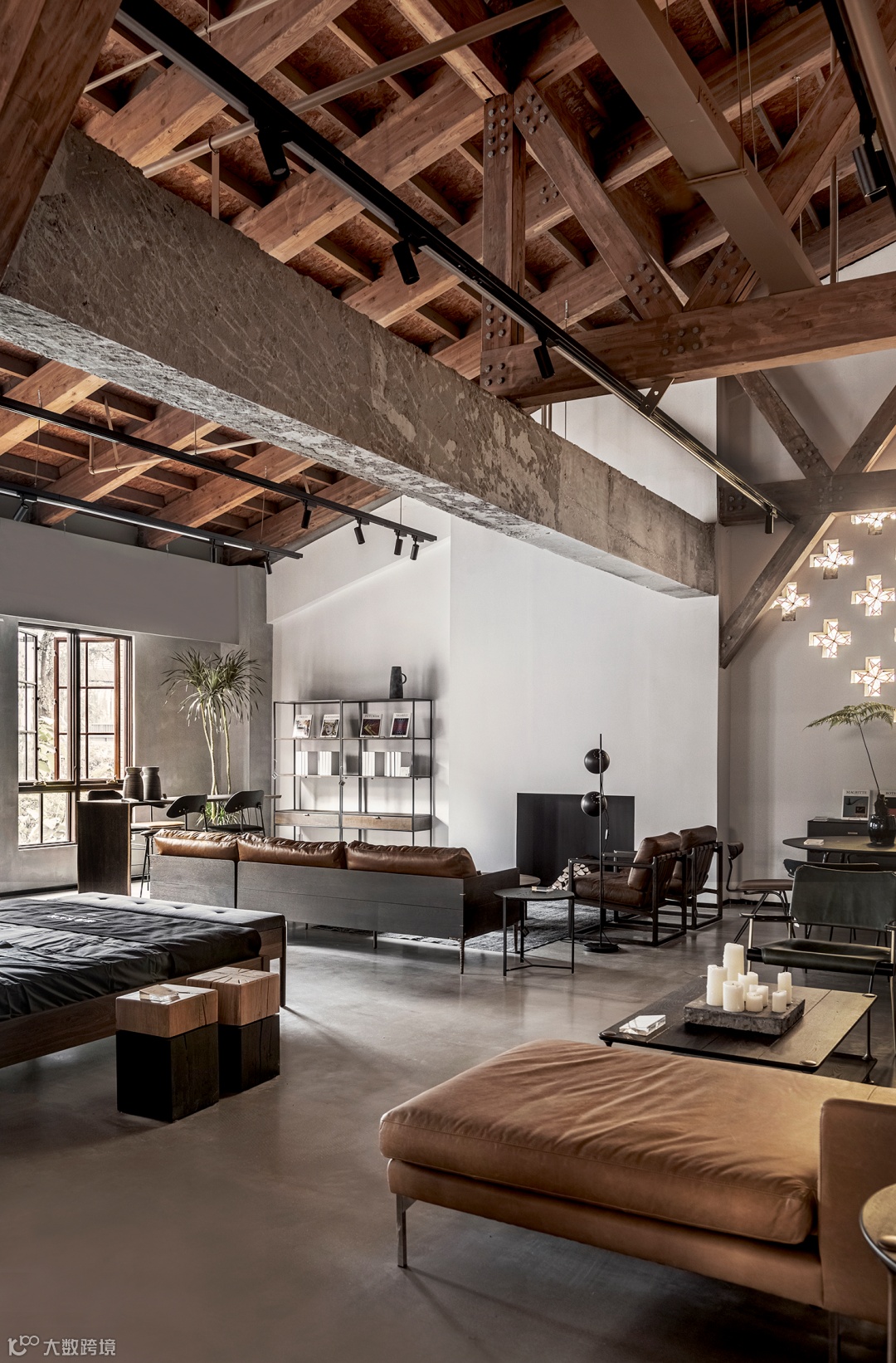 现代风格的家居展示空间与经过保护修复的桁架结构并存并形成强烈视觉冲击。家居的色泽质感与桁架木色相呼应,光感的暗示使大跨度空间变得亲切。通过将材料质感与颜色关联,体现新与旧的融合,让整栋建筑拥有和谐统一的视觉感和空间感。