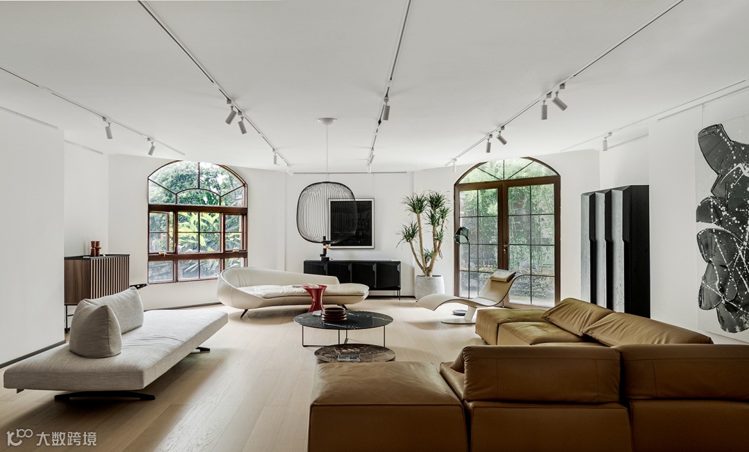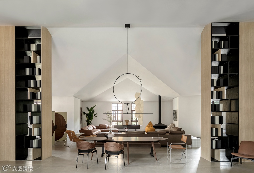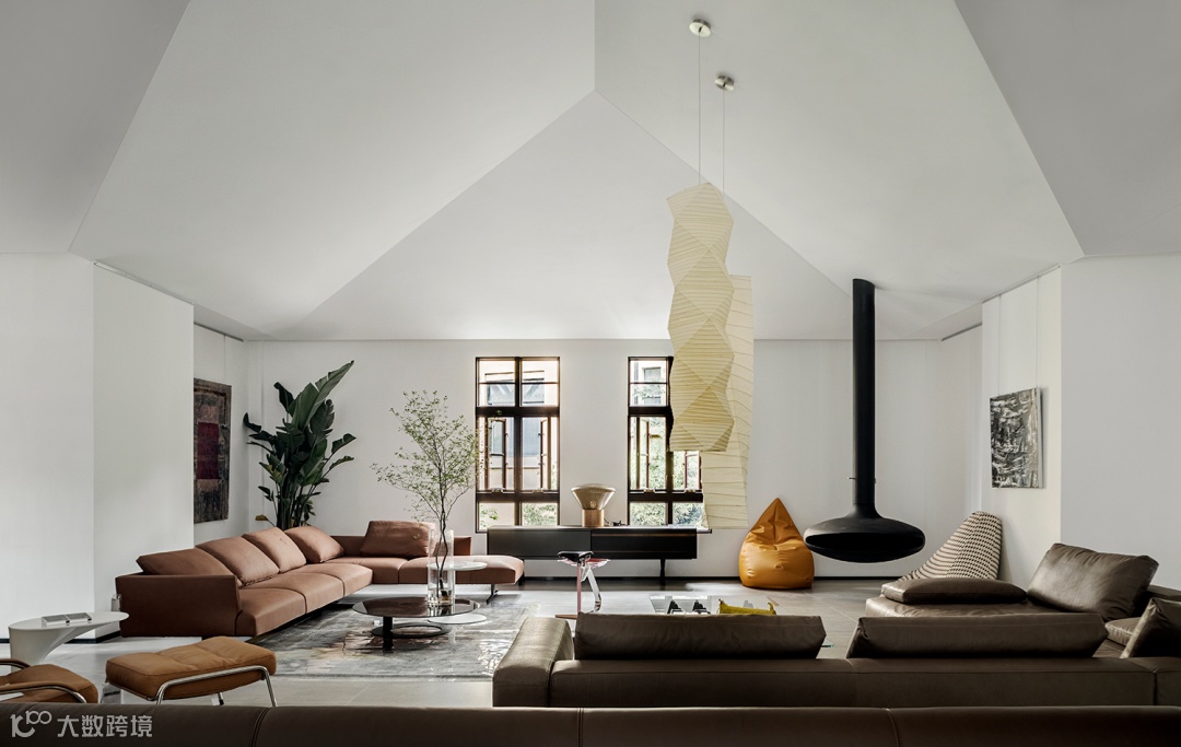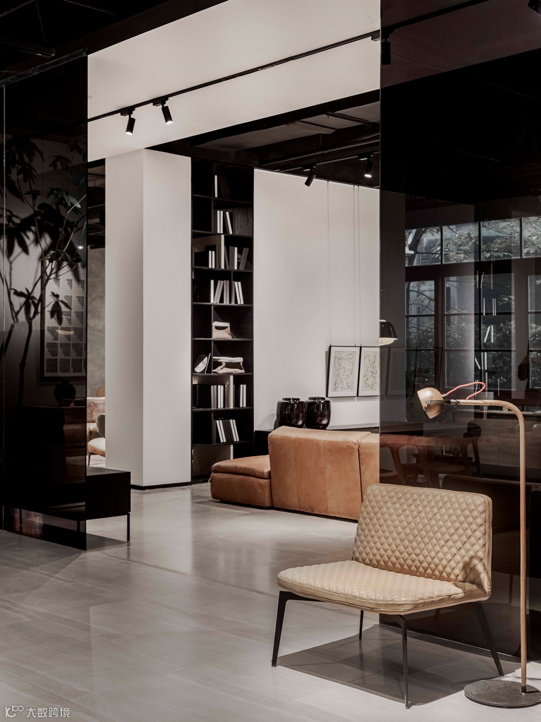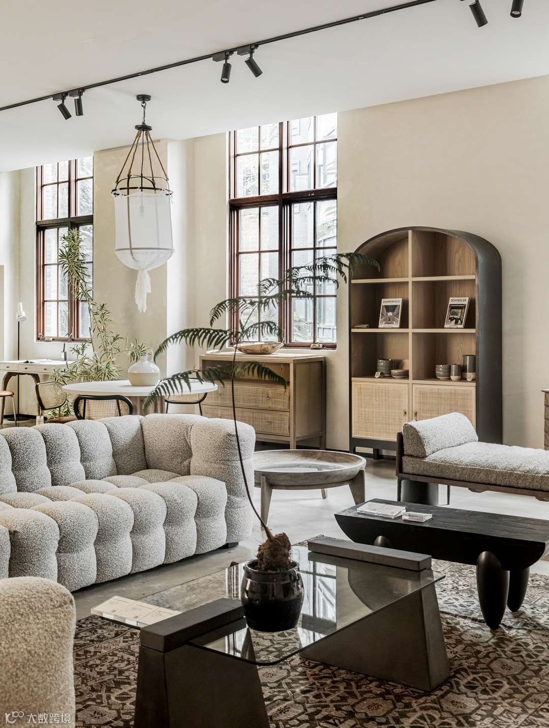 现代风格的家居展示空间与经过保护修复的桁架结构并存并形成强烈视觉冲击。家居的色泽质感与桁架木色相呼应,光感的暗示使大跨度空间变得亲切。通过将材料质感与颜色关联,体现新与旧的融合,让整栋建筑拥有和谐统一的视觉感和空间感。