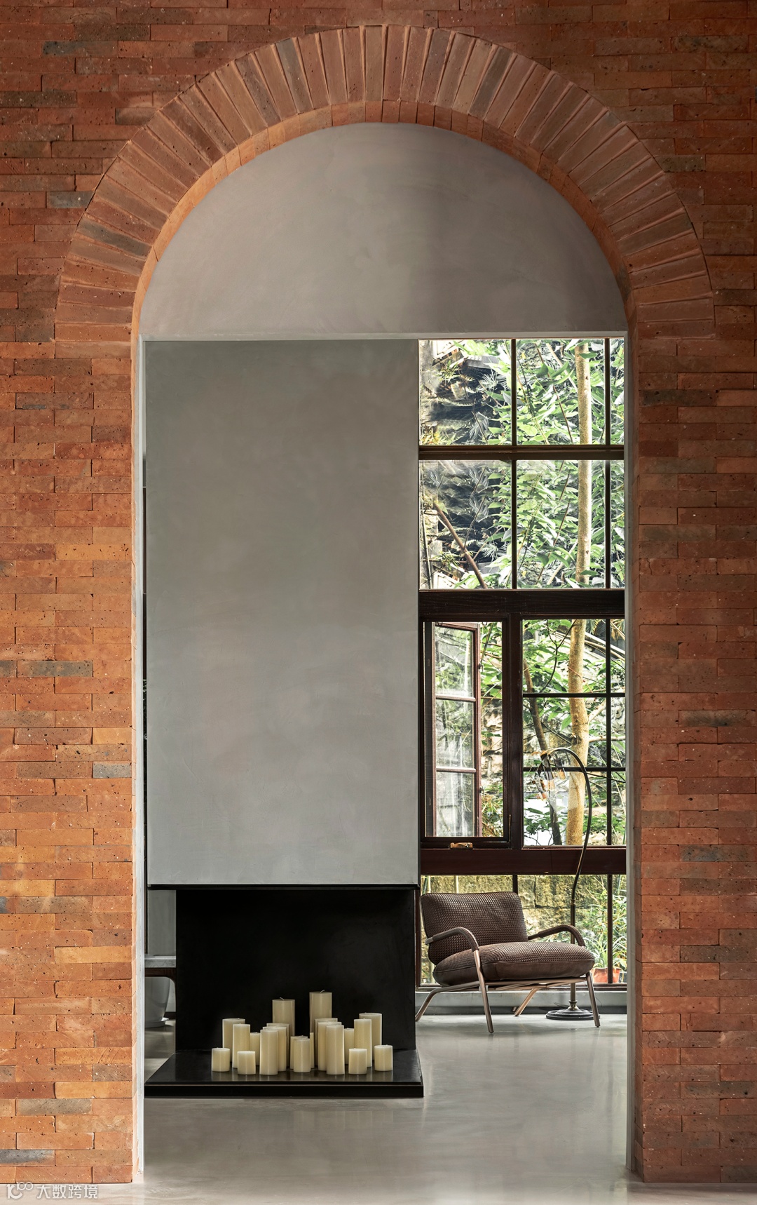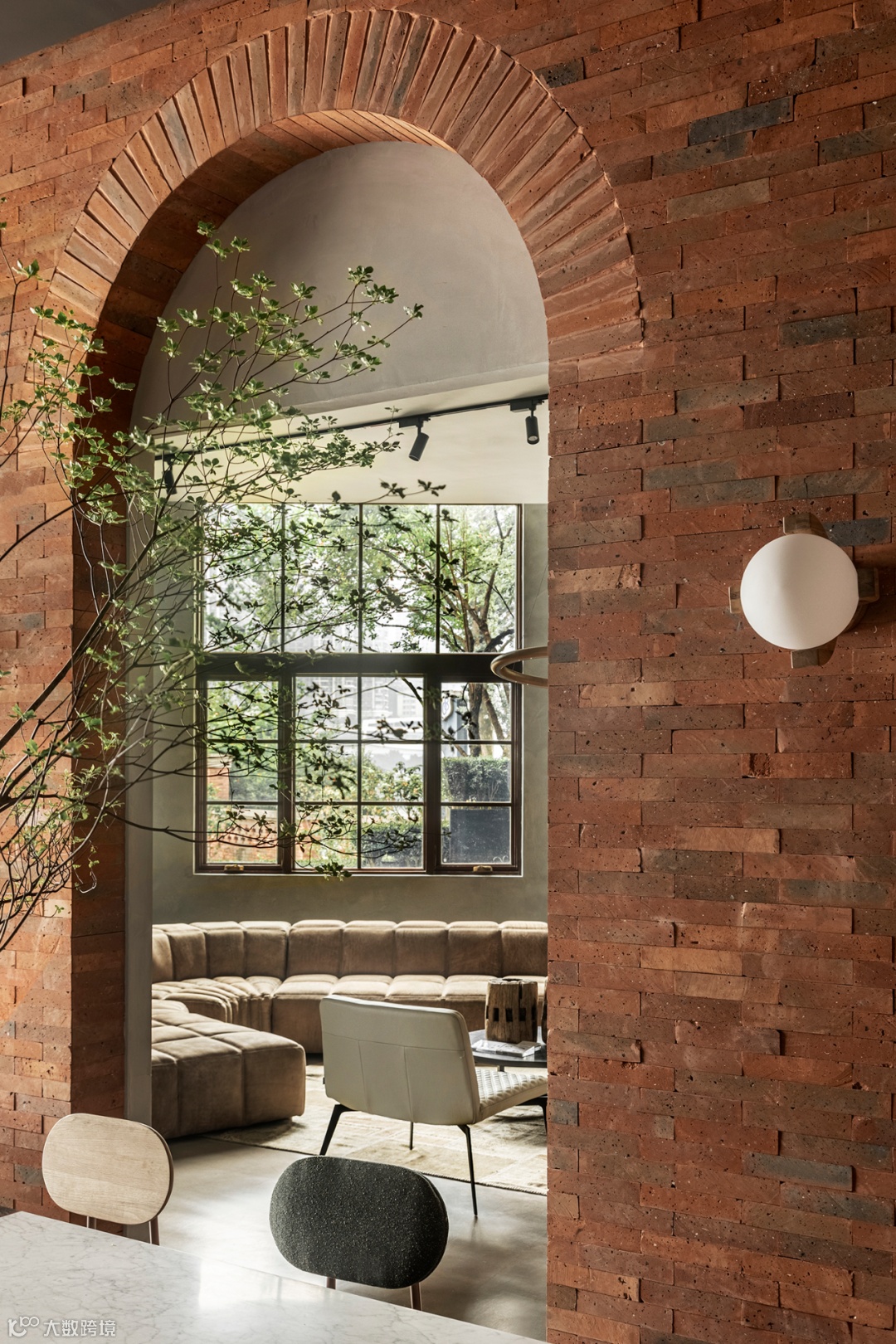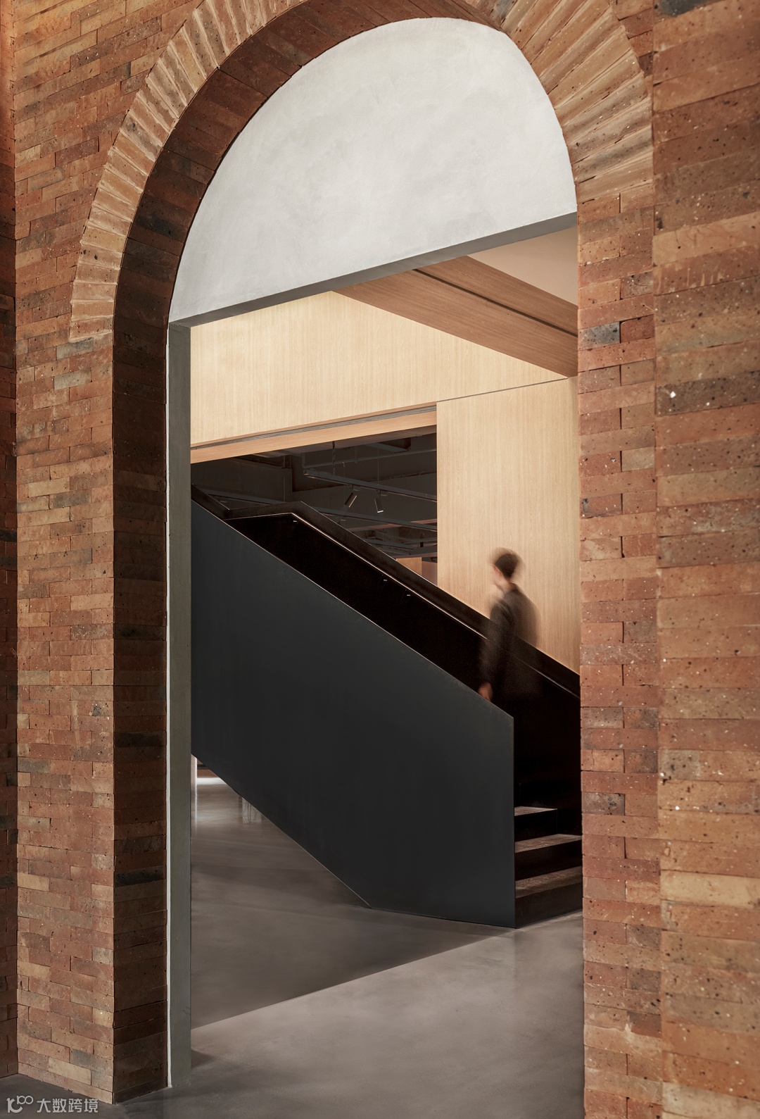 设计师将建筑立面完整地保留下来,并将标志性的记忆感受延伸到室内,入口前厅使用与外立面呼应的红砖与拱形元素,将新旧两种材料通过“拱窗”与“门”的比例与形式感联结。
