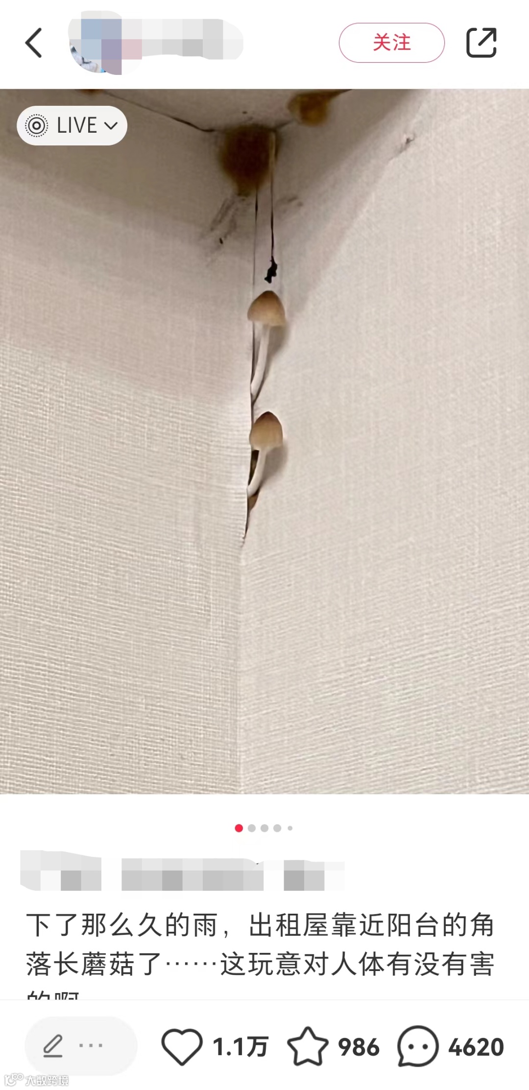 甚至有人家里不见阳光的阴角还会长出蘑菇,如下图所示: