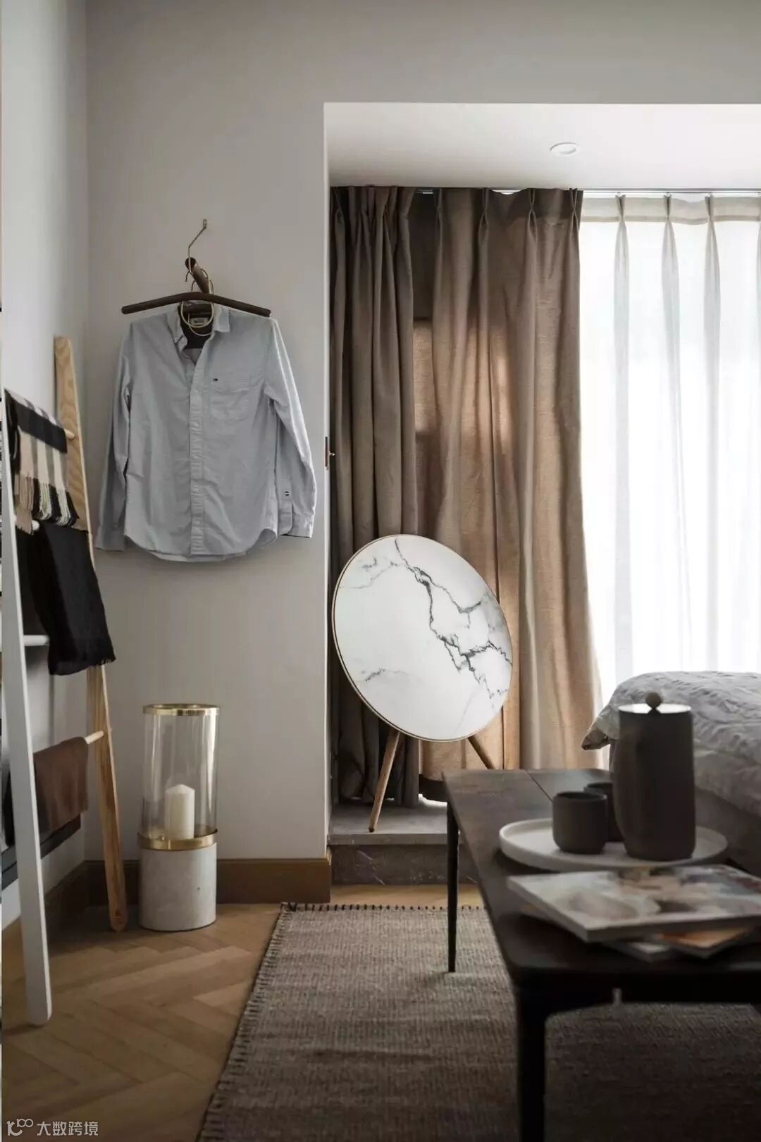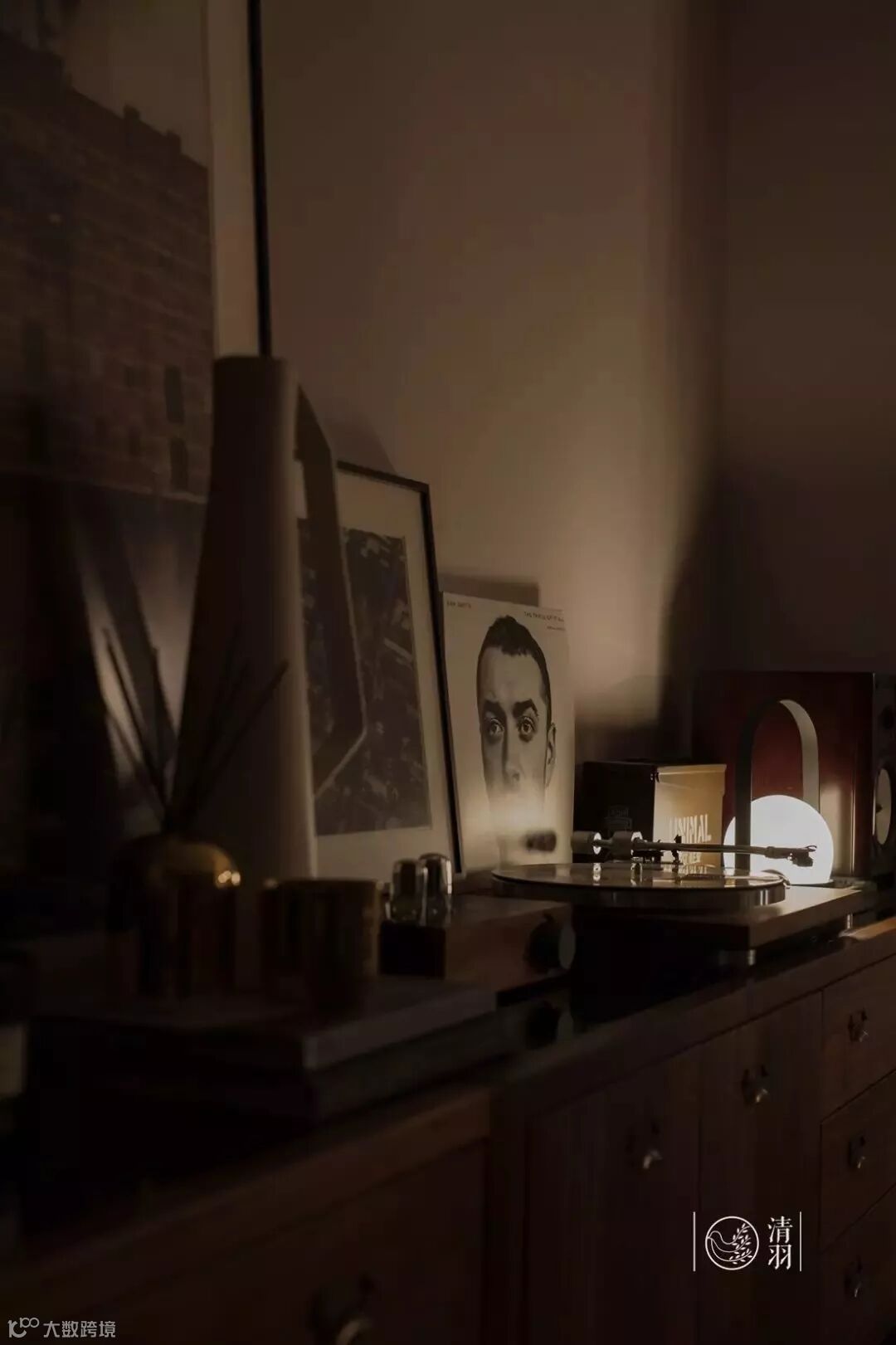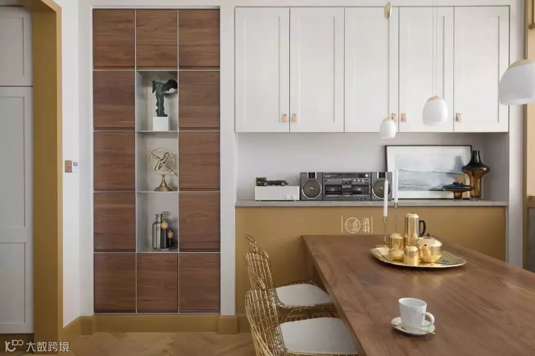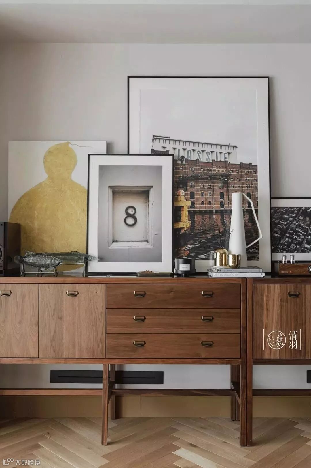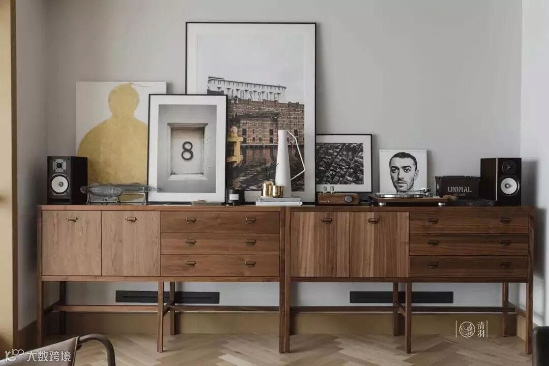 记录者双门边柜,组合方式刚好放进两墙之间,除了整齐配套的大容量收纳,随机的木纹拼接也带来了十分新鲜的视觉效果。放上黑胶唱片机和装饰画,就是个兼具功能、质感和高级意趣的完美一面。