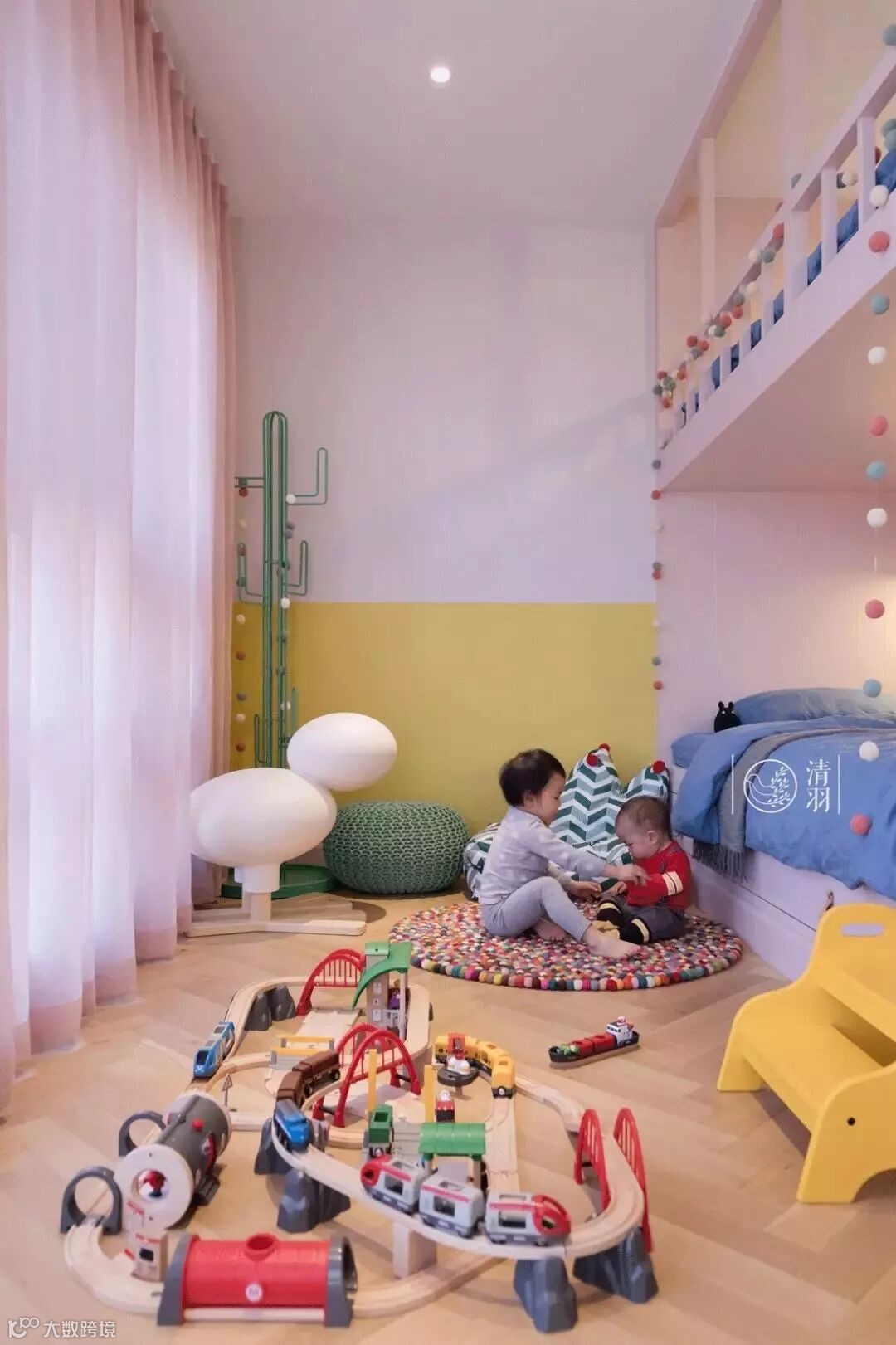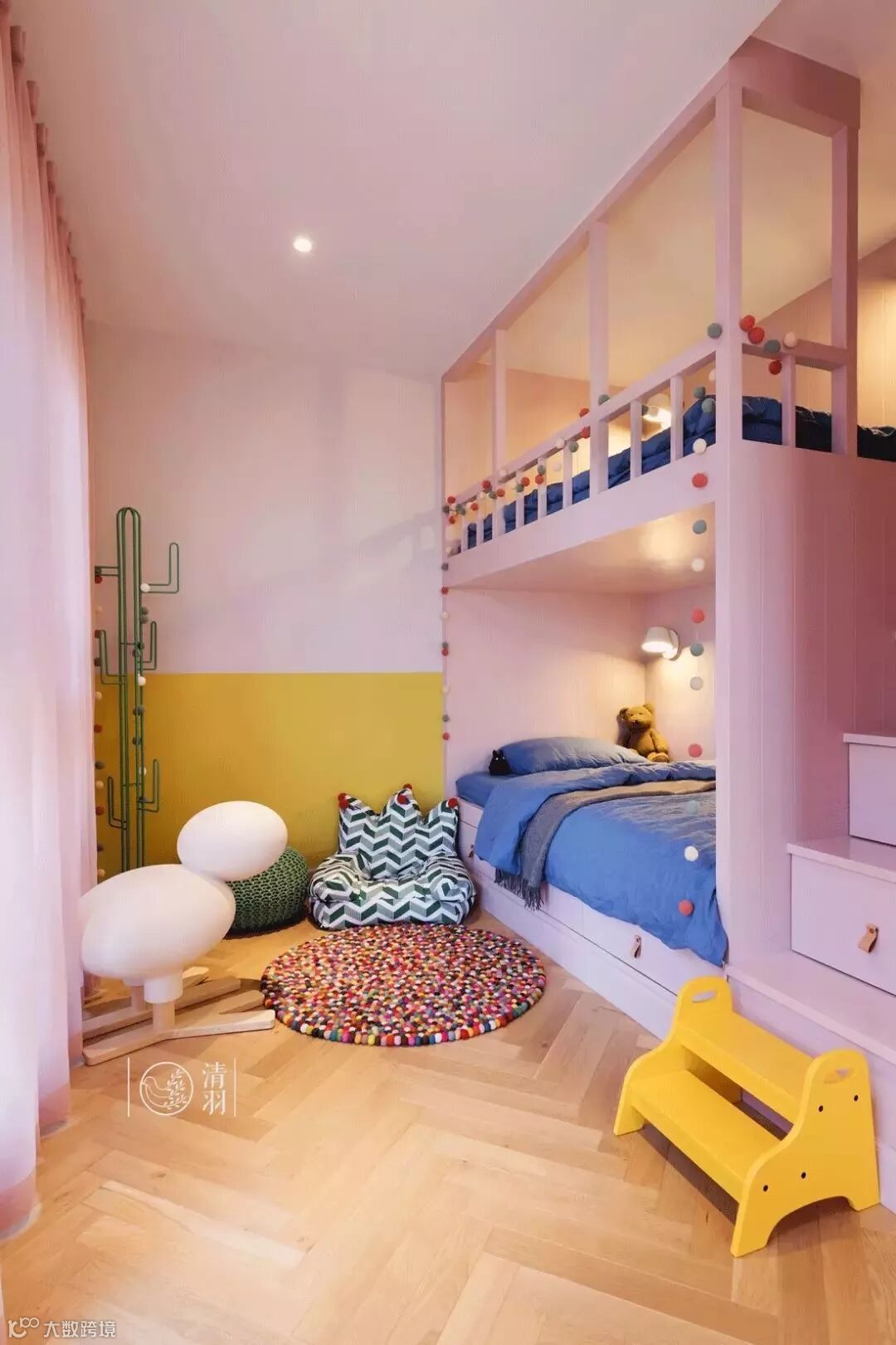为了给两个宝宝更多活动空间,设计师特意定制高低床,并且整合了书柜和大容量衣柜。等她们逐渐长大,还可以再按需添置家具。