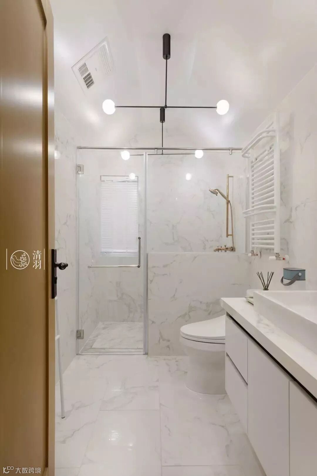 次卫是主卫的同系列延伸。依旧使用了大理石,营造白色的通透感。