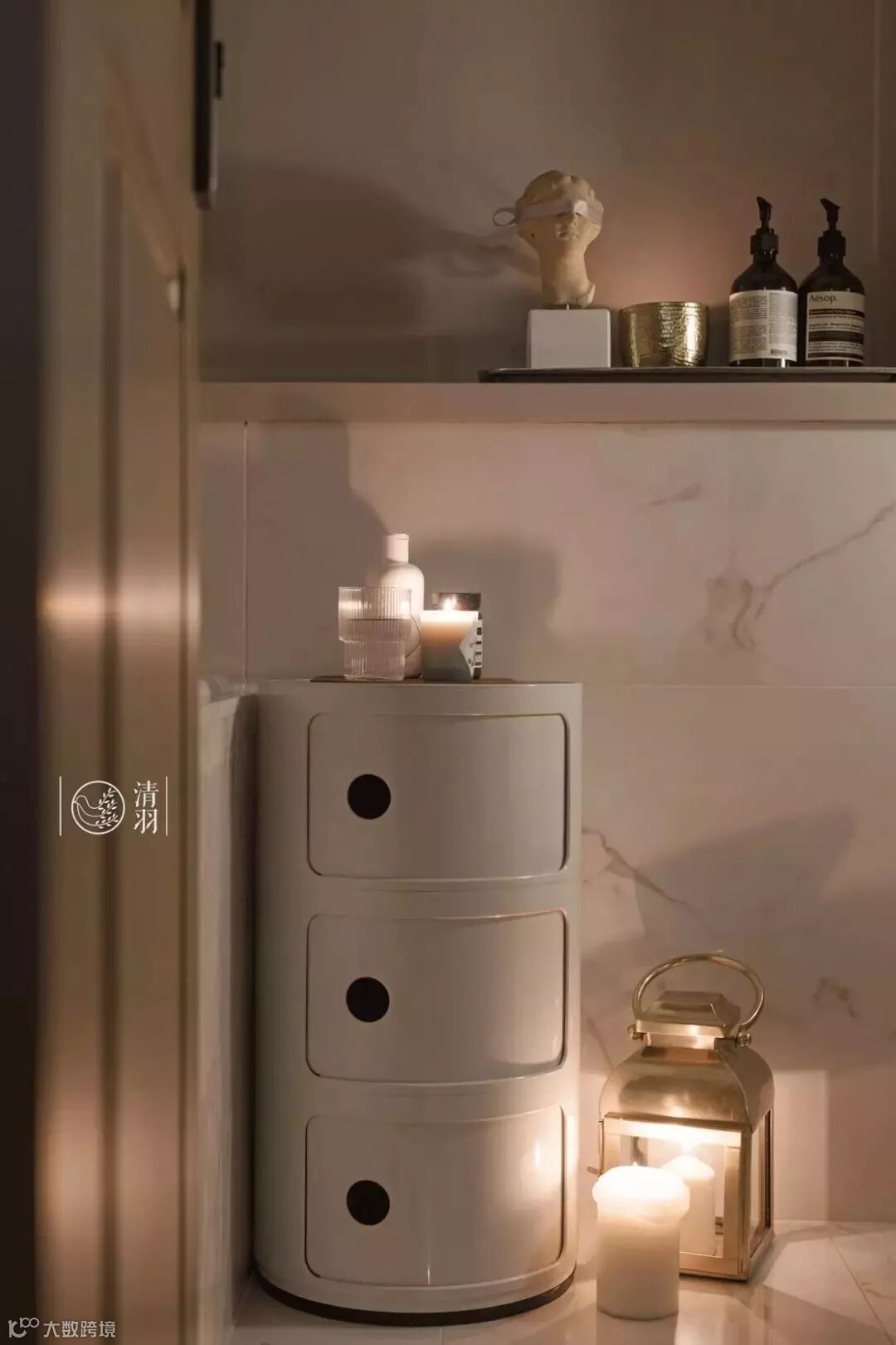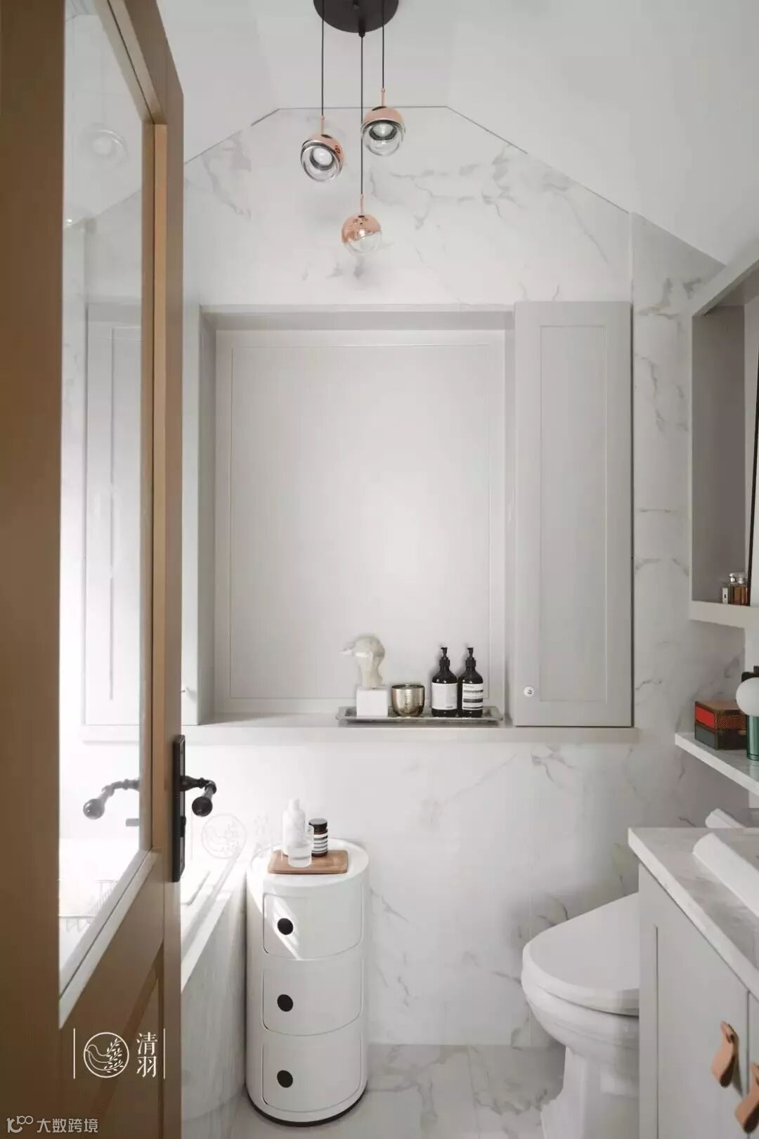 白色基调的卫生间,有着通透的光线,大理石的自然纹理恰似粼粼波光。墙上空间也没闲置,分别做了壁龛和滑门收纳柜,常用物品都能方便收纳拿取。