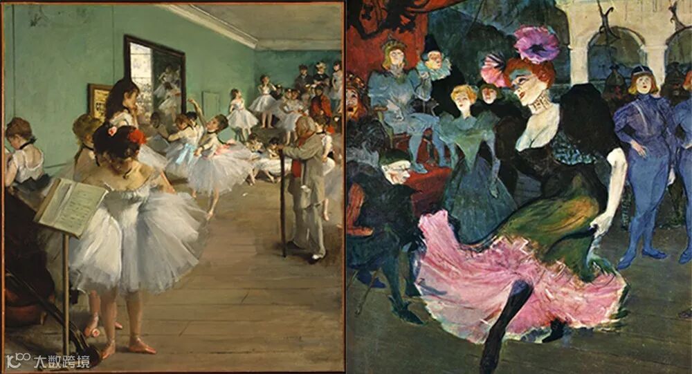 ▲左图为埃德加·德加的《芭蕾舞女》。右图为亨利·德·图卢兹·罗特列克的画作