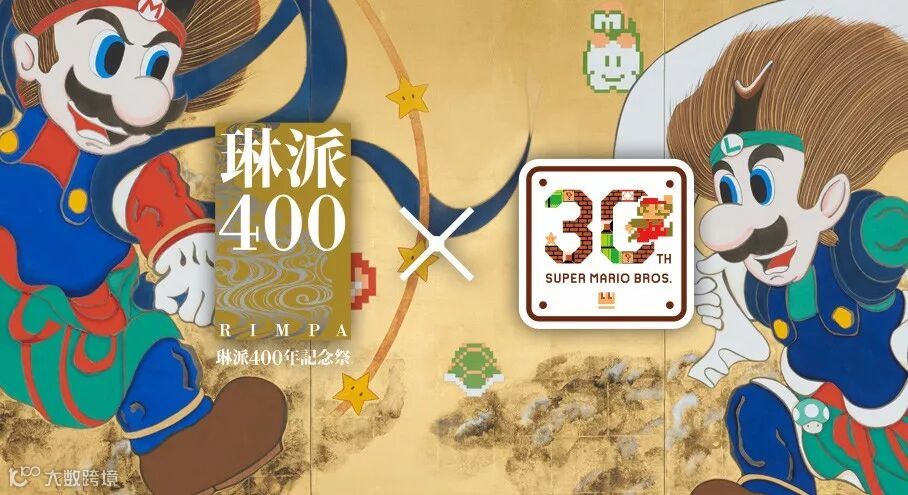 这一年,适逢任天堂经典游戏系列《超级马里奥》的30周年,也是日本造型艺术流派“琳派”400周年的生日。双方因此合作,将《超级马里奥》与日本国宝级琳派绘画作品《风神雷神图》相结合,由当代“琳派”艺术家山本太郎创作了一副巨型屏风,并于当年的10月23日在京都美术馆展出。