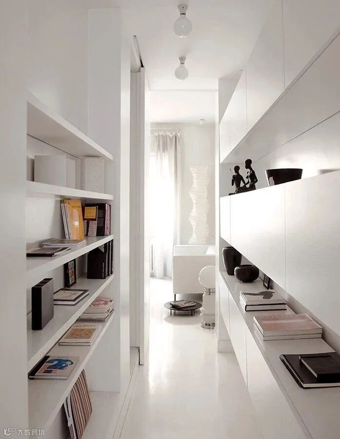 走廊书架可以在一定程度上解决家里没有独立书房的困扰,营造一个书香满满的家居氛围。