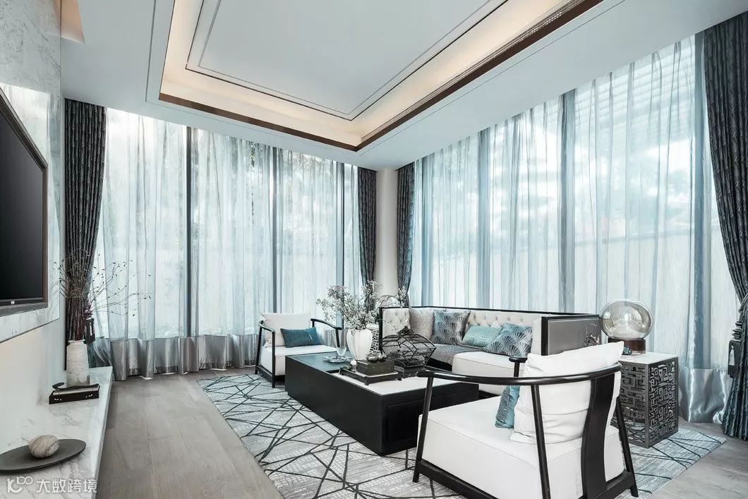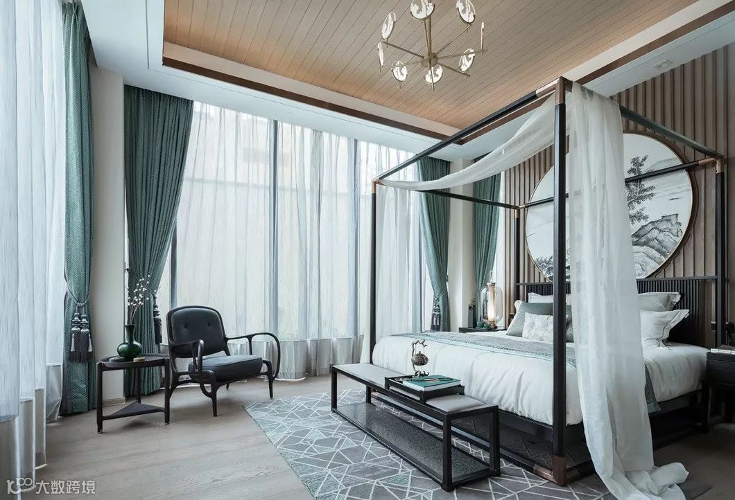 少去了繁复的雕刻花纹,融入线条的写意,让整个空间带有一种中式的美感,融入天圆地方的概念,以一种特别的方式展现出独有的干净利落。空间中运用蓝+绿对比色调,富有层次感,能带来冲击性的视觉效果,令人印象深刻。