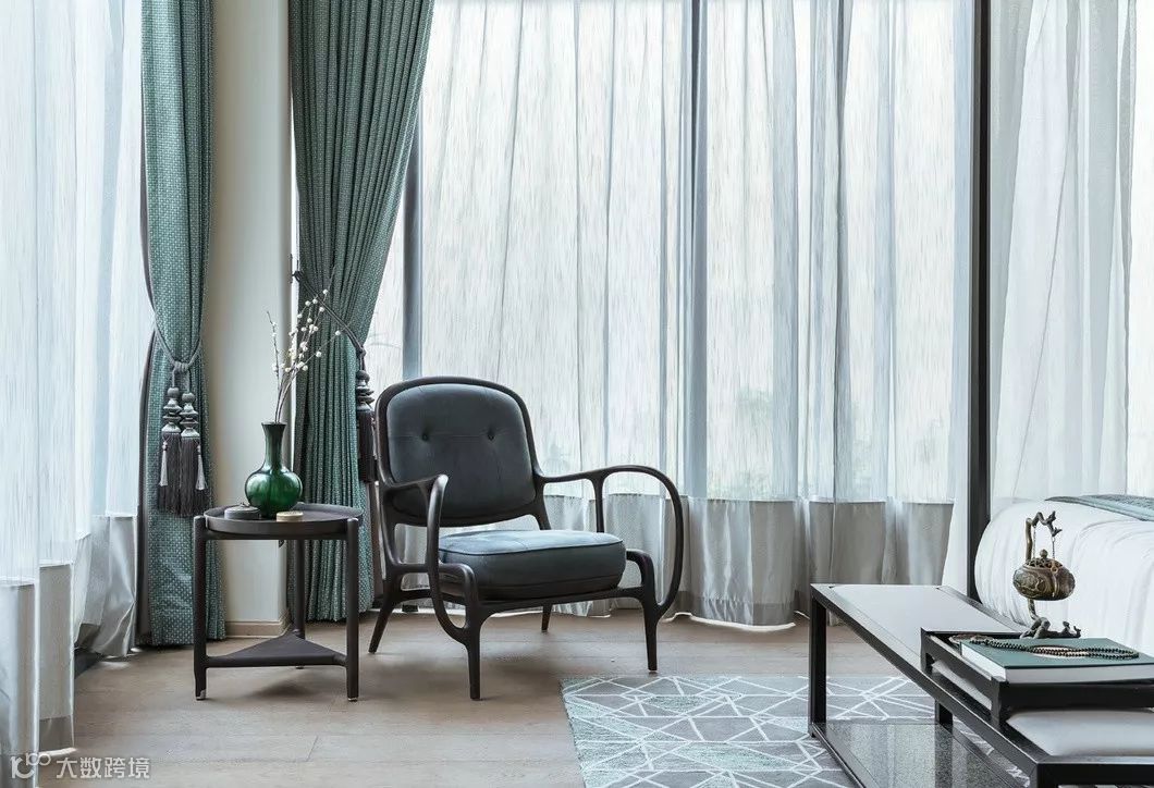 布艺陈设之间运用同色系不同颜色的绿,显得恬淡可亲,地面几何形图案勾勒的地毯产生立体感,从而营造出大而不空,厚而不重的层次感。在视觉上产生一种既安静又温馨的感觉,清雅的气质与空间感觉十分匹配。