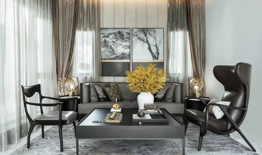 将带有黑色与帝国黄印花元素布艺融入到饰品之中,与窗帘窗幔结合,高明度与饱和度带来的极高辨识度赋予了它无与伦比的色彩表现力,加深了整个空间的视感维度,成为空间最惹眼的存在。