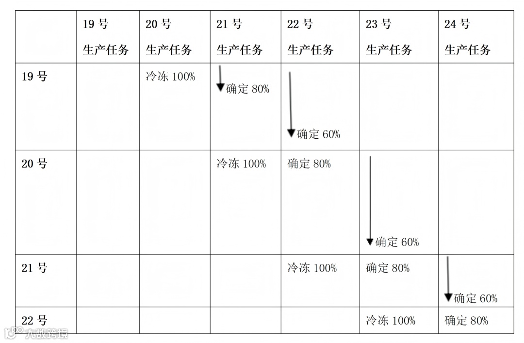 如表格所示,到了20号,就将21号的生产任务从80%确定到100%,将22号的任务从60%确定到80%,再把23号的生产计划纳入进来,确定到60%。因为这份计划是一天天往下滚的,所以叫做冷冻滚动日计划。